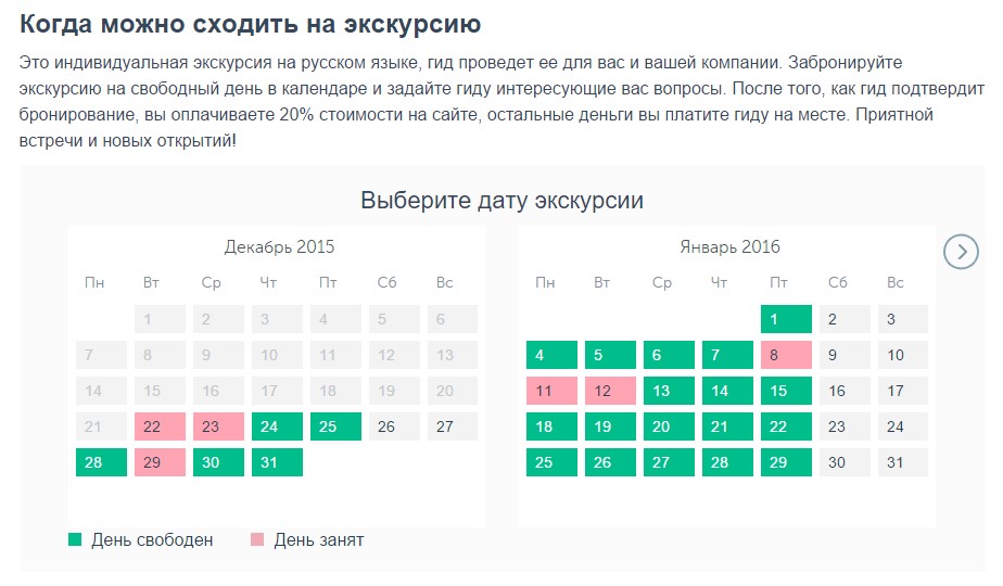 Но если экскурсии для вас — хобби и вы готовы проводить их только по воскресеньям, и при этом публикуете расписание на неделю вперед, то учтите, что у путешественника будет очень маленький выбор доступных для экскурсии дней.
