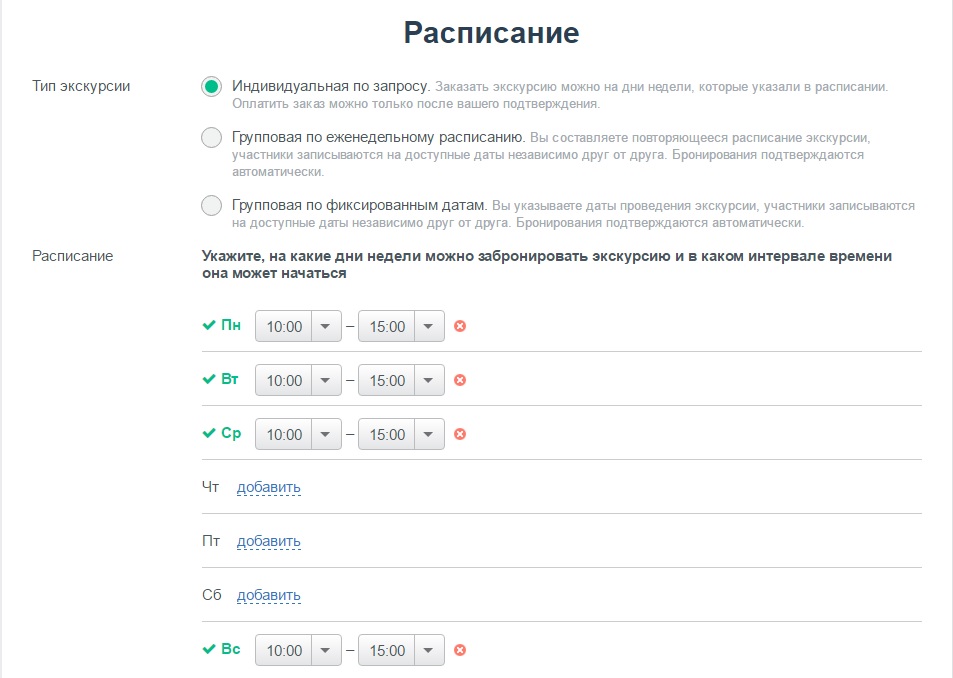 Расписание можно настроить отдельно для каждой экскурсии. Вы указываете дни недели когда проводите экскурсию и время в течение дня, на которое ее можно забронировать. Одну экскурсию можно, например, сделать только по выходным, другую по будням, а третью — в любой день.