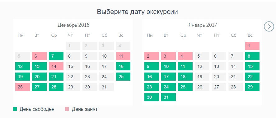 Отмечайте щелчком мышки занятые дни, когда вы не можете проводить экскурсии. Занятые дни перекрашиваются в красный цвет и становятся недоступными в расписании всех ваших экскурсий. Обязательно пользуйтесь этим, чтобы не получать заказы на дни, когда вы заняты. Это хорошо влияет на статистику работы с заказами.