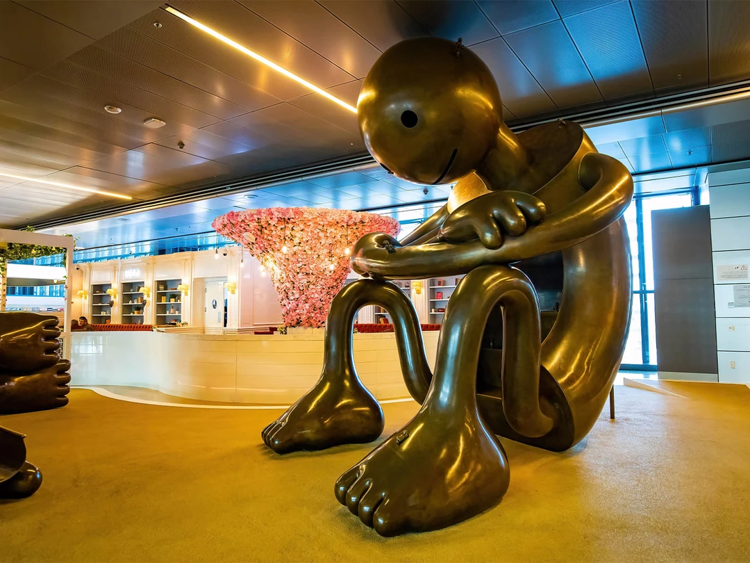 Центральным и самым узнаваемым экспонатом этой бесплатной галереи стала работа швейцарского художника Урса Фишера «Лампа‑медведь». Гигантская, словно плюшевая, игрушка с настольной лампой сразу же приковывает взгляд. Не менее знаменит «Космос» Жана‑Мишеля Отониэля — завораживающий глобус из бусин, который олицетворяет пути путешественников. Также запоминается объект издательства KAWS «Маленькая ложь», который русские путешественники с улыбкой прозвали «Чебурашкой, опоздавшим на рейс».