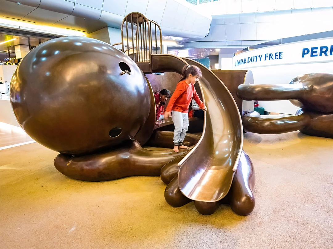 Внимания заслуживают площадки с работами американского скульптора Тома Оттернесса. Его инсталляция «Другие миры» — гигантские литые фигуры с горками и сиденьями вместо рук или части туловища. Дети могут забираться на них, исследовать и скатываться. Вокруг больших форм рассыпаны десятки миниатюрных фигурок: изображения путешественников, прошедших через аэропорт.