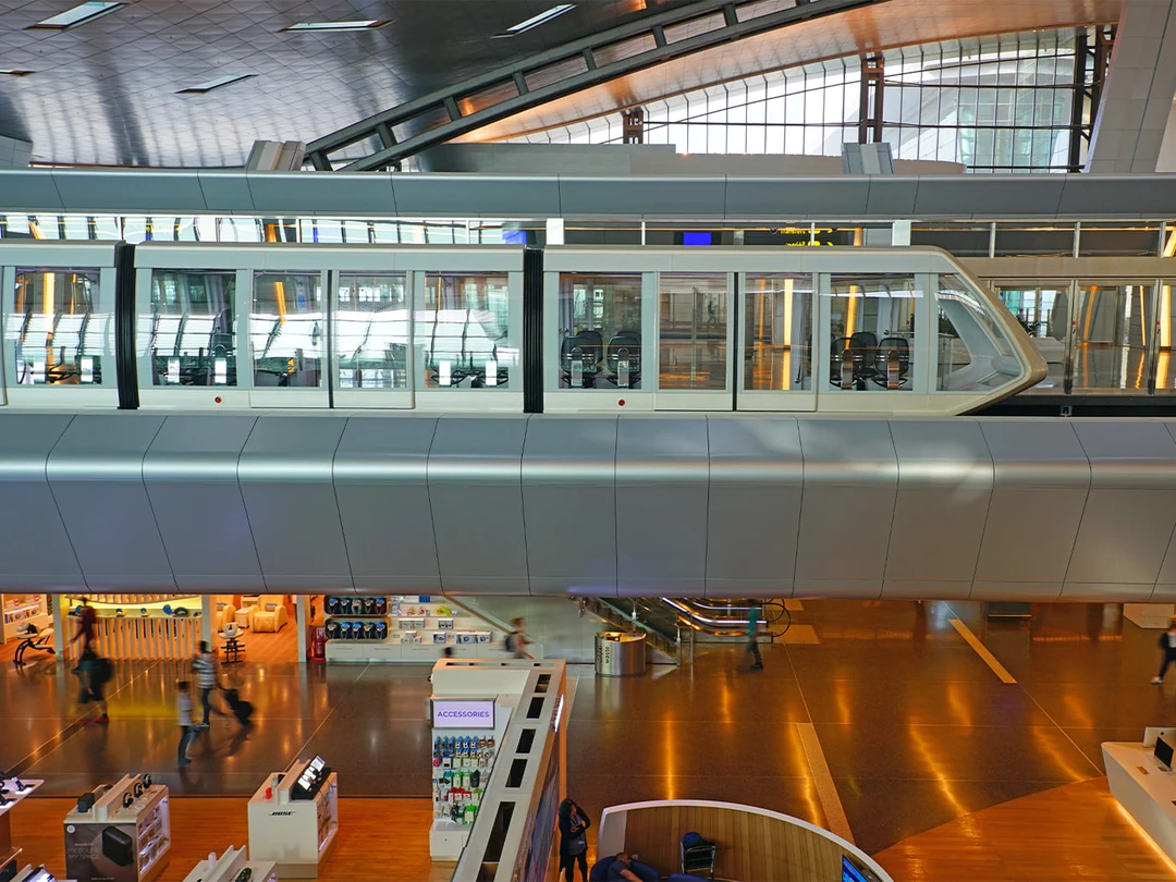 Прямо внутри аэропорта Дохи скользит эффектный поезд с прозрачной стеклянной крышей и панорамными окнами. Плавность хода обеспечивает высокотехнологичная пневмоподвеска — даже на скорости вы не почувствуете ни толчков, ни вибраций, лишь почти бесшумное скольжение по рельсам. Маршрут соединяет ключевые точки аэропорта и пролегает от станции у выходов A/B до терминалов D/E.
