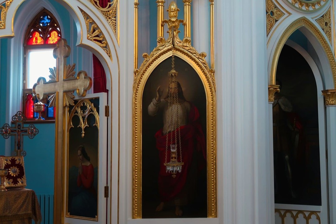 Этот действующий православный храм на территории музея-заповедника был возведён для семьи Николая I. Сооружение напоминает небольшой готический собор — со стрельчатыми порталами, окнами-розами и шпилями с крестами (правда, православными). Фасад украшают детали из литого чугуна и многочисленные скульптуры ангелов, святых апостолов, Богоматери с младенцем.