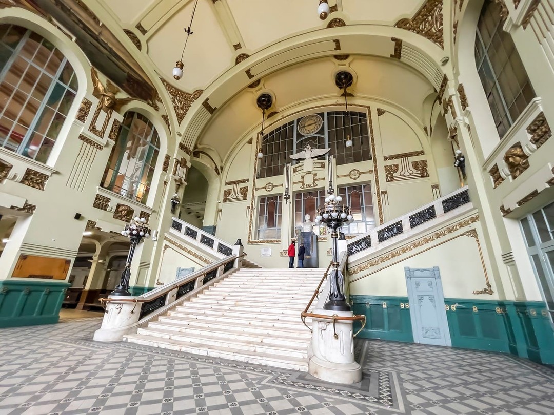 Особенности стиля можно исследовать по интерьерам этого роскошного здания: здесь есть и балконы с коваными решётками в форме лиры, и ажурные козырьки над входами, и витражные окна, и лепные панно с изображением Меркурия. Тут часто завтракали Анна Ахматова и Николай Гумилёв, а ещё в этих залах снимали популярные фильмы: «Приключения Шерлока Холмса и доктора Ватсона», «Вокзал для двоих», «Брат».