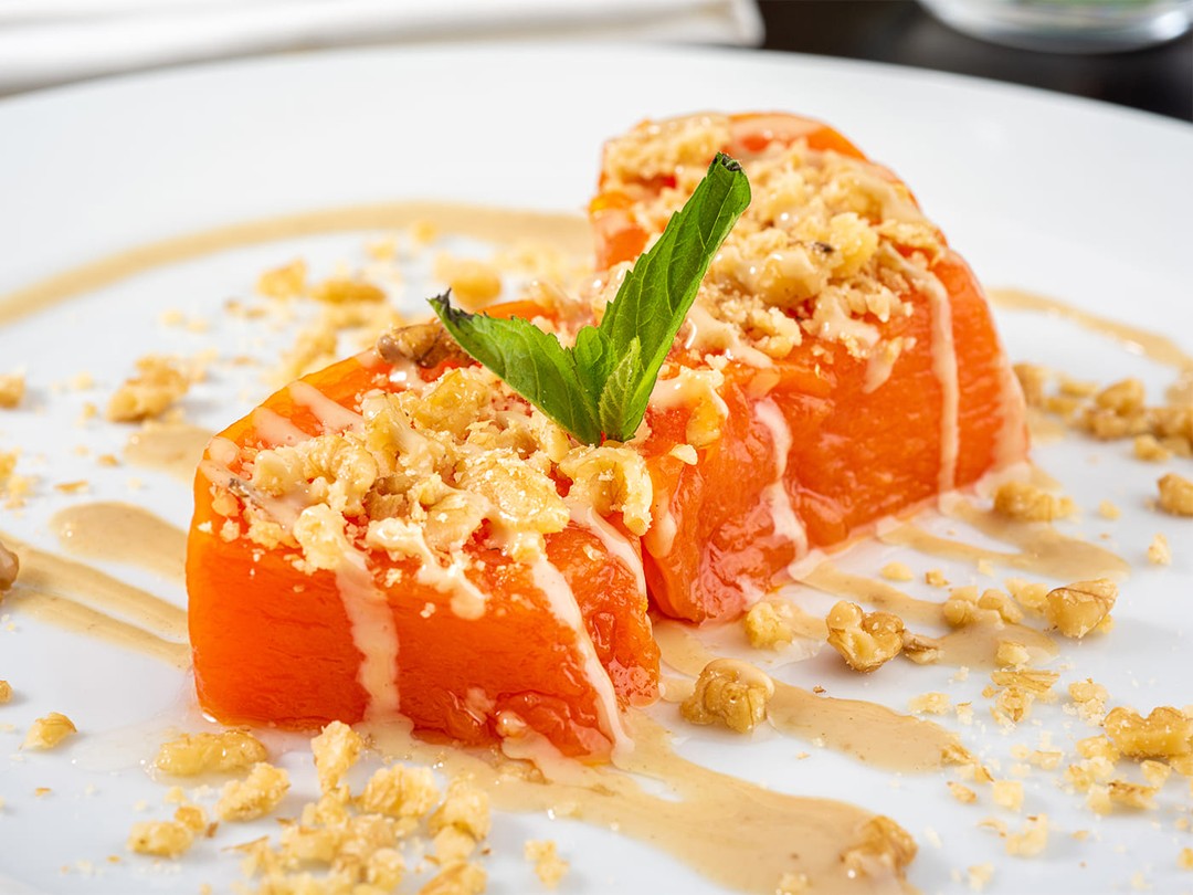 - Тыква с тахини. Кусочки сладкого овоща выдерживают в сахарном сиропе. Подают с кунжутной пастой и молотыми грецкими орехами