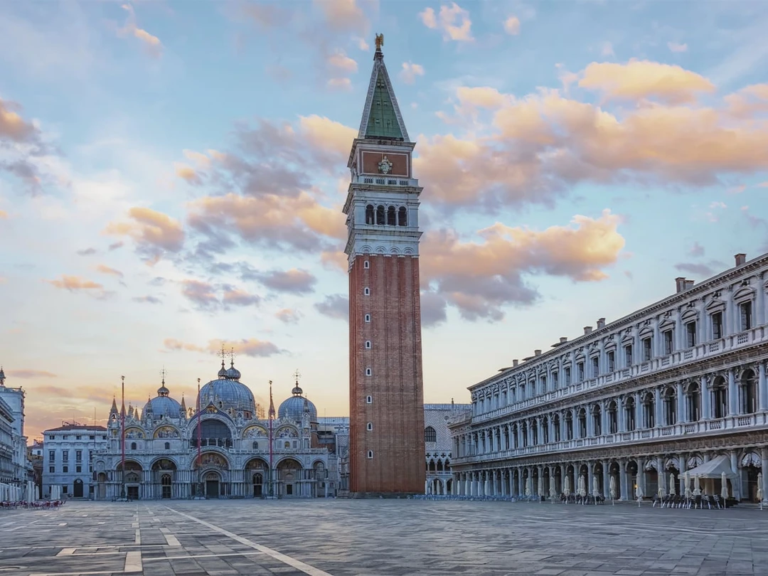Здесь вместо улиц город пересекают извилистые каналы, а вместо шума машин — плеск воды о ступени старых дворцов. В лабиринтах улиц, где навигатор часто беспомощен, легко потерять счёт времени и почувствовать себя настоящим первооткрывателем. Но все пути приведут вас к самому сердцу Венеции — на площадь Сан‑Марко, где можно выпить эспрессо в самом старом кафе Италии «Флориан», основанном в 1720 году. После этого зайдите в красующийся здесь же собор Сан‑Марко, на куполах и сводах которого сверкают византийские мозаики общей площадью около 8 тысяч м². А завершить осмотр центра города лучше всего на колокольне высотой 98 метров, с которой открывается панорама всей Венеции, а в ясную погоду даже видны Альпы.