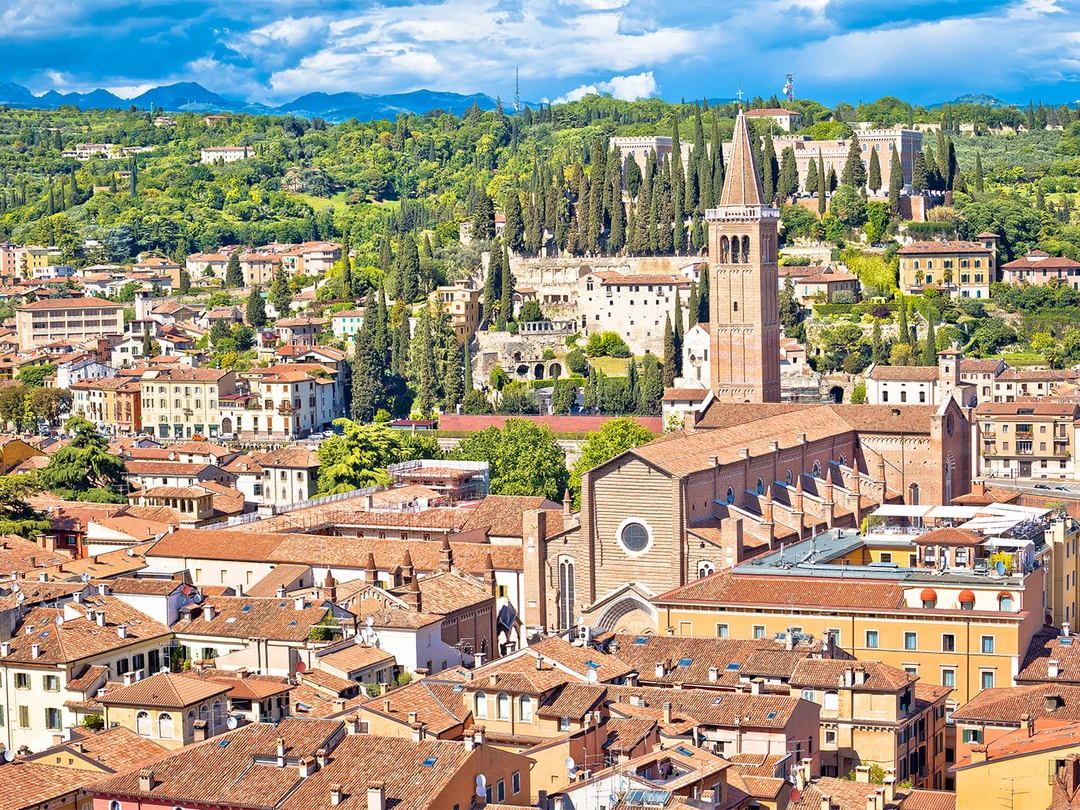 Чтобы почувствовать ритм города, проведите время на Пьяцца делле Эрбе. Эта площадь на месте древнеримского форума сегодня ежедневно превращается в оживлённый рынок, наполненный ароматами кофе и выпечки из окружающих её кофеен и пекарен. А перебравшись через мост Понте Пьетра, можно подняться пешком или на фуникулёре к замку Кастель‑Сан-Пьетро. Отсюда открывается, пожалуй, самый узнаваемый и живописный вид на черепичные крыши Вероны и изгибы реки Адидже.