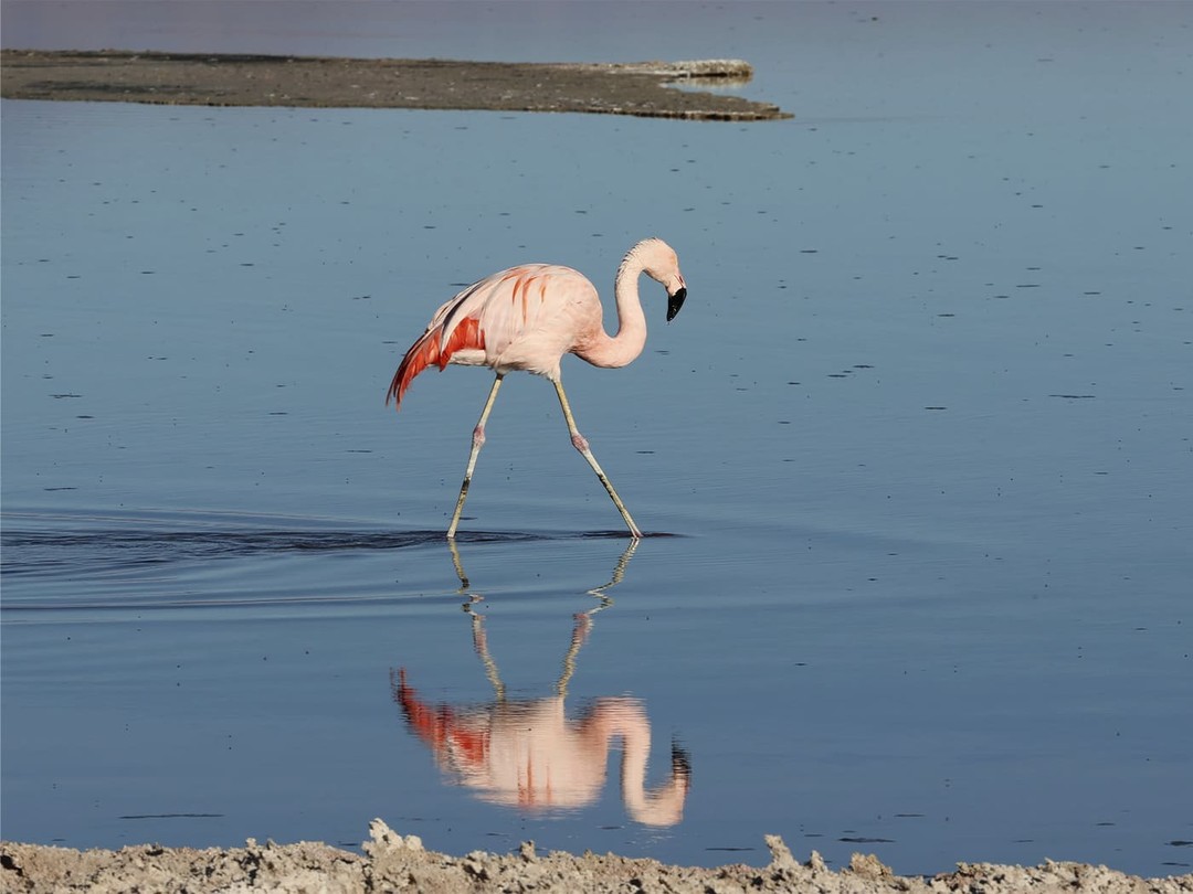 Лагуна Чакса находится на территории солончака Атакама, примерно в 60 километрах от Сан‑Педро. Это мелководная лагуна с высокой концентрацией соли, где обитают несколько видов фламинго. На фоне белоснежной поверхности солончака и вулканов розовые птицы выглядят особенно контрастно и ярко.