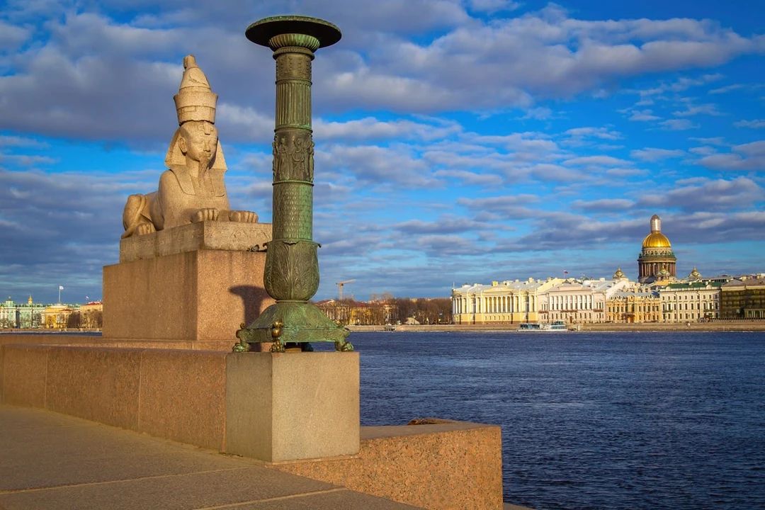 Отдельного внимания заслуживает пристань со скульптурами грифонов и сфинксов. Последние — родом из Египта с раскопок Поминального храма Аменхотепа III в Фивах, а в Петербург попали в 1832 году и спустя два года заняли своё место на набережной. Здесь же находятся четыре бронзовых грифона, в пасть которым, согласно городской легенде, надо положить руку и загадать желание.