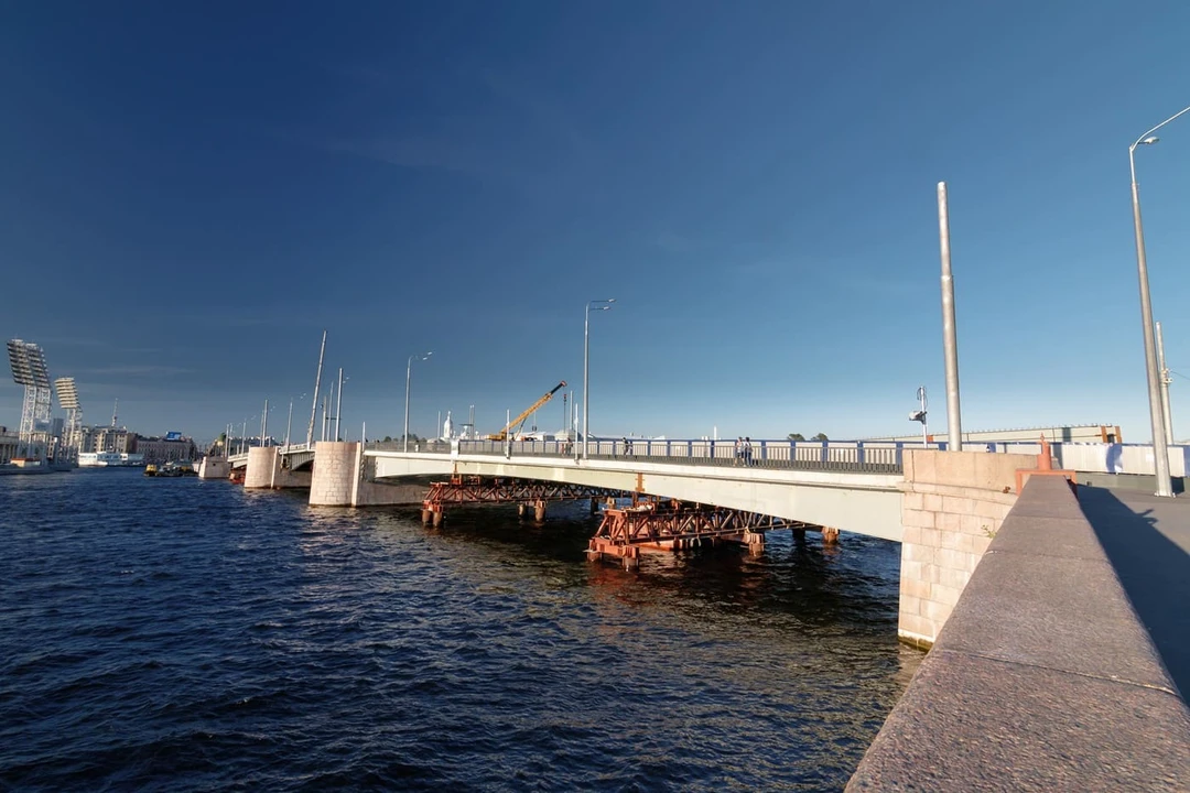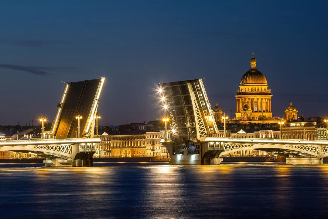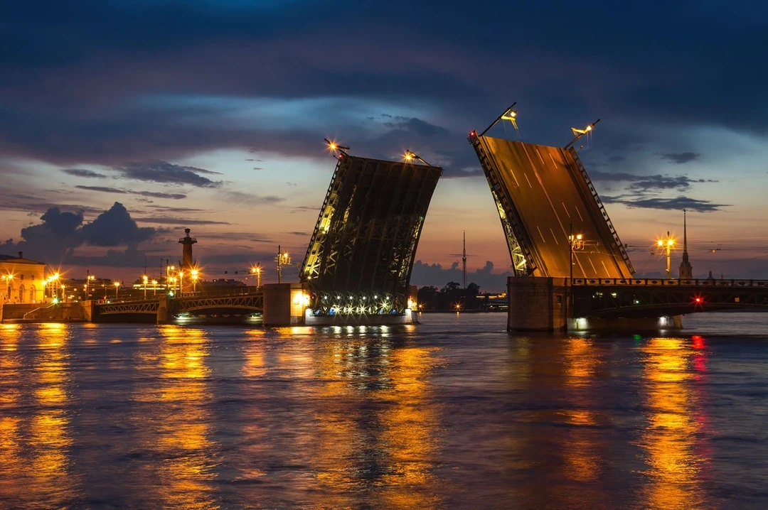 - Дворцовый мост — считается одним из символов Санкт‑Петербурга и принимает ежегодное участие в шоу «Поющие мосты». Так в мае 2022 года его поднимали под классические композиции, а на одном из пролётов можно было увидеть лазерные проекции портретов основателя города и великих писателей.