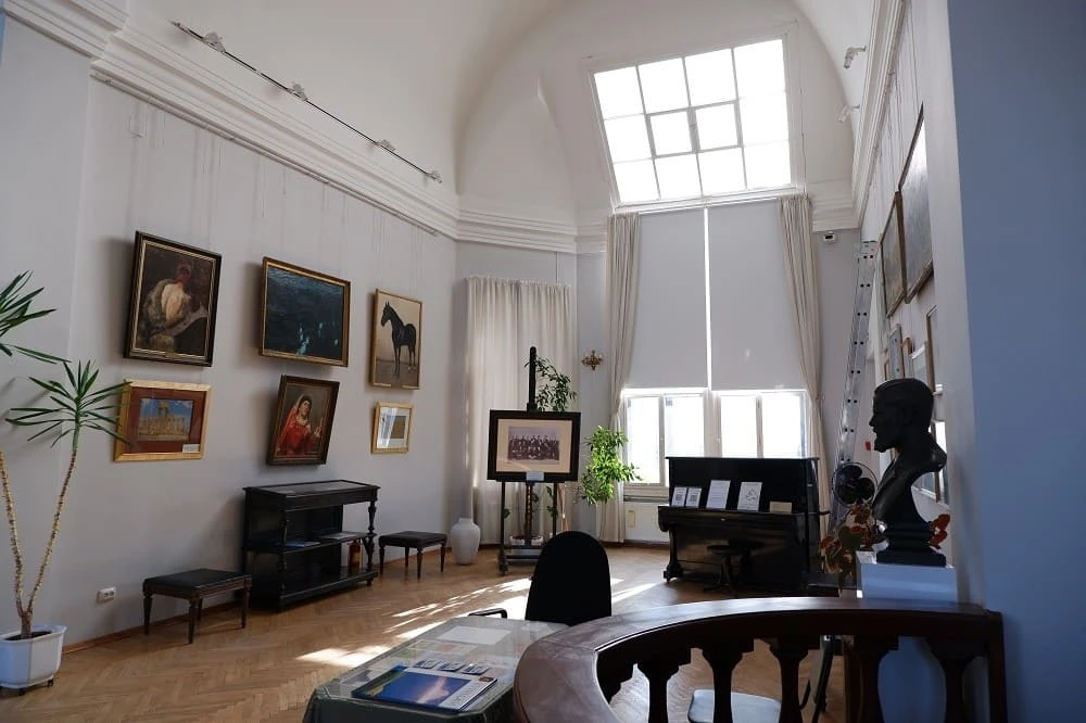 Сегодня в музее‑квартире для посетителей открыты гостиная и кабинет, а в мастерской действует выставка, посвящённая педагогической работе А. И. Куинджи.