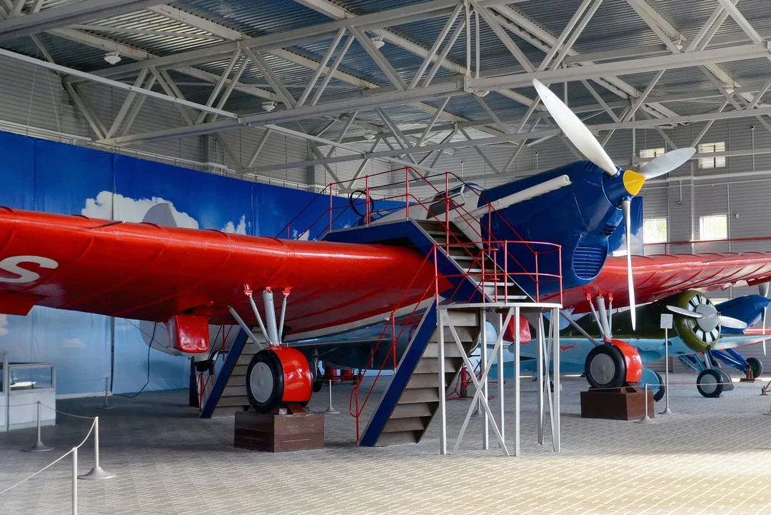 Рядом с домом — ангар с самолётами, на которых Чкалов летал и которые испытывал. Среди них — и знаменитый АНТ‑25: на нём он совершил перелёты на Дальний Восток и в Америку (через Северный Полюс).