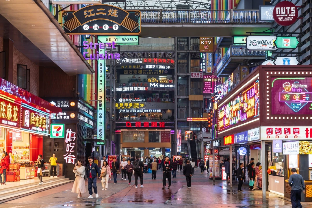 Для первого знакомства с Чунцином и погружения в его бешеный ритм логичным выбором станет район Цзефанбэй — сердце делового центра. Здесь вы окажетесь среди сверкающих небоскрёбов, огромных торговых моллов и бесчисленных уличных лотков с едой. Главные локации будут в нескольких минутах ходьбы, что избавит вас от необходимости ездить на метро. Окружает Цзефанбэй район Юйчжун: здесь немного потише, но всё ещё близко до всех знаковых мест.