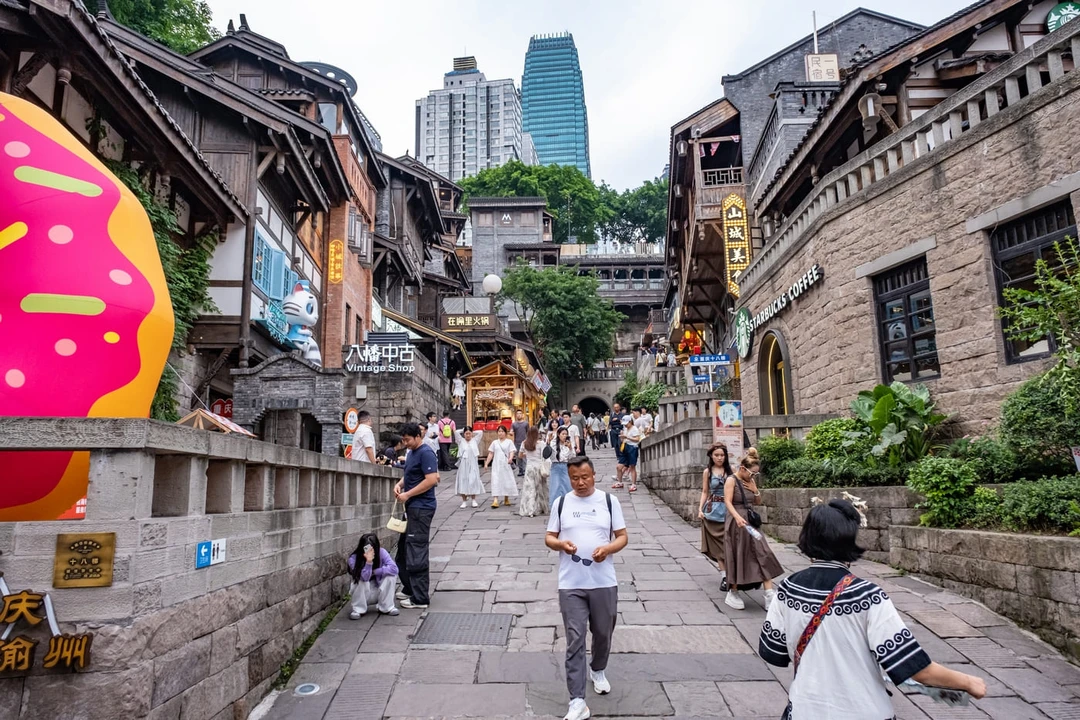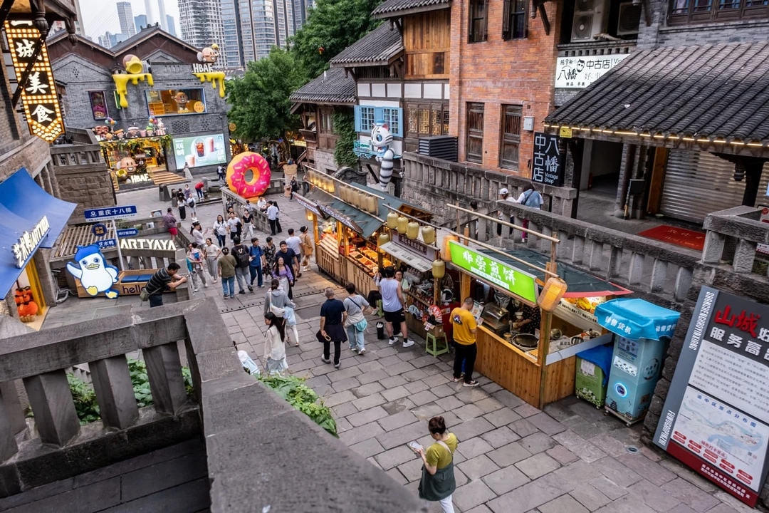 Сегодня Шибати — это восстановленный с удивительной детализацией квартал. Его узкие улочки заставлены низкими домами, между крышами которых мелькают потрясающие виды на современный Чунцин. Старинные здания соседствуют с дизайнерскими магазинами, многочисленными кафе и ярким стрит‑артом. Здесь можно увидеть сцены повседневной жизни из прошлого: лавки, чайные, старые вывески, сохранённые как часть городского наследия. Вечером район преображается: повсюду включается мягкая жёлтая подсветка.