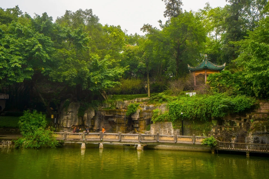 Одна из самых старых и живописных зелёных зон Чунцина появилась в 1909 году как частный сад богатого предпринимателя. В середине XX века парк передали муниципалитету и превратили в общественный. Название этого места переводится как «Холм гусиной шеи»: такое имя оно получило из‑за длинной и изогнутой формы, напоминающей шею птицы.