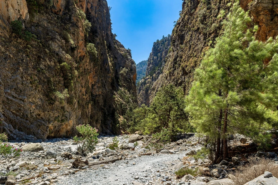 Путешественники со всего мира приезжают сюда, чтобы совершить пеший поход по его дну. Маршрут проходит мимо заброшенной деревни Самария со старинной церквушкой Святой Марии Египетской, через кипарисовые и сосновые рощи, а также знаменитые «Железные ворота». Это самое узкое место в ущелье: скалы здесь расположены на расстоянии всего четырёх метров друг от друга. В пути можно увидеть редких диких коз кри‑кри с витыми рогами — живой символ Крита.