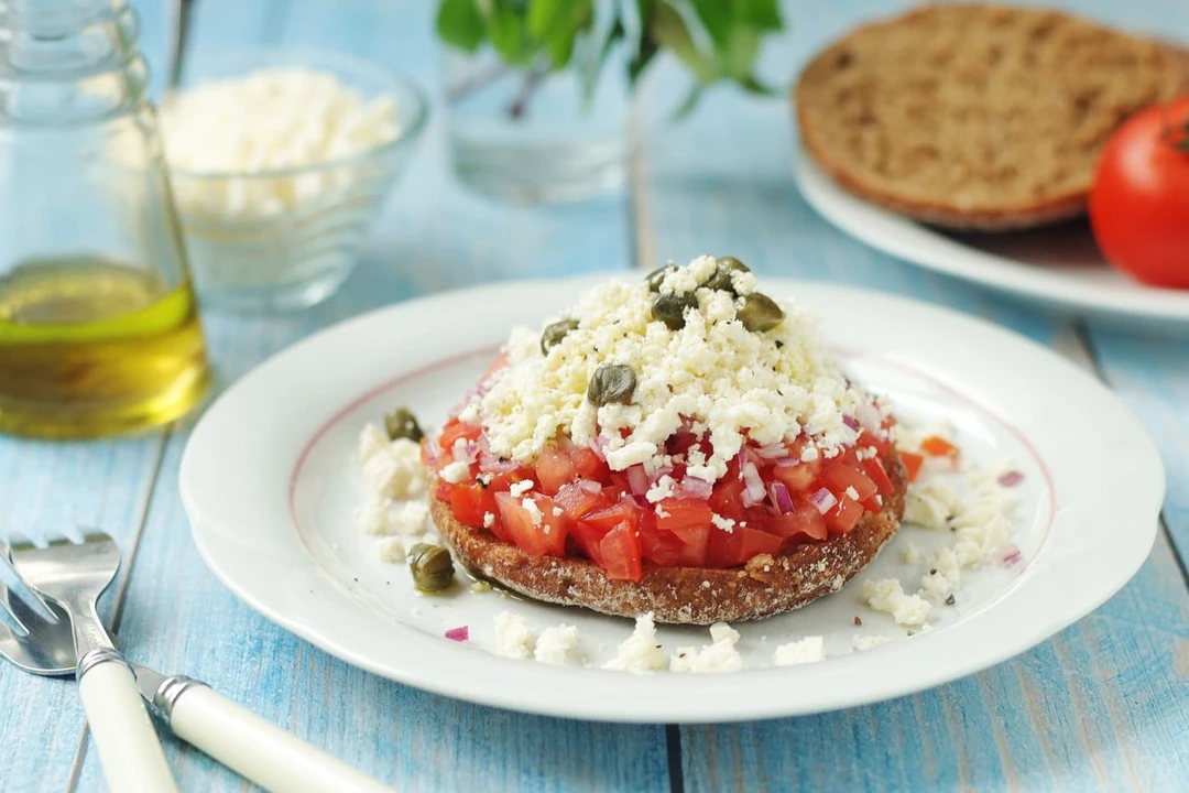 Например, дакос — традиционное критское блюдо из больших сухарей ржаного хлеба, которые размачивают в оливковом масле, а сверху покрывают тёртыми помидорами, фетой или козьим сыром и орегано.