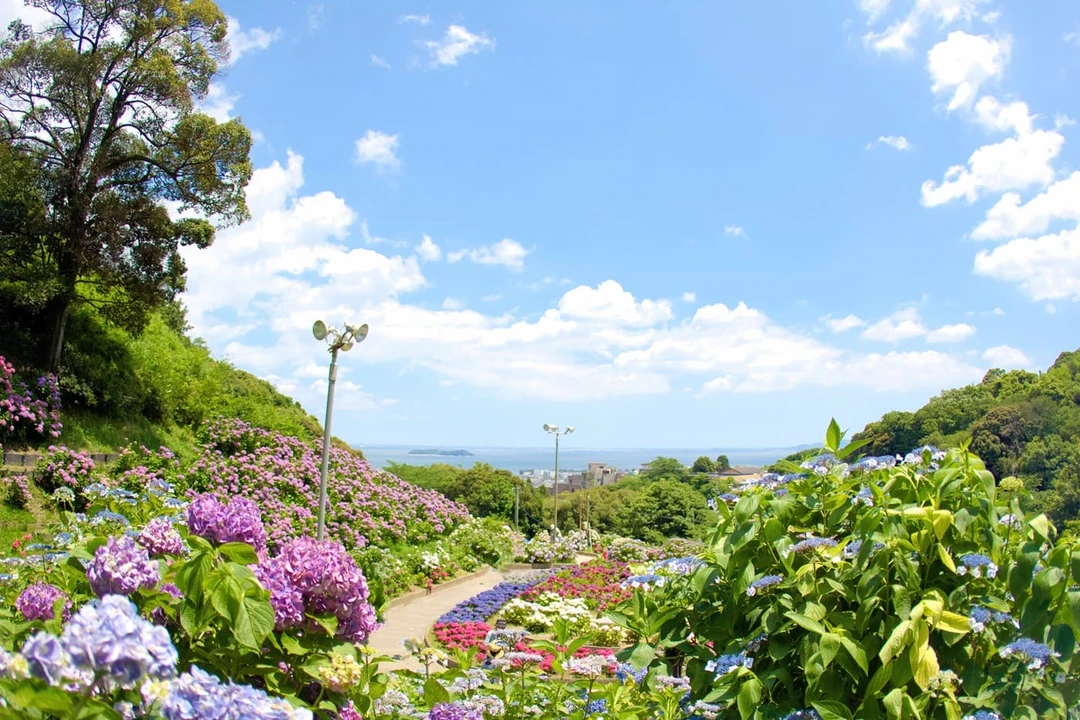 Одна из крупнейших фестивальных площадок находится в городе Гамагори. Это так называемая деревня гортензий Катахара Онсэн. Одновременно здесь расцветает около 50 тысяч растений разных сортов. В это время территория деревни буквально утопает в разноцветных цветочных облаках. Особенно волшебно локация выглядит с заходом солнца, когда включается подсветка.