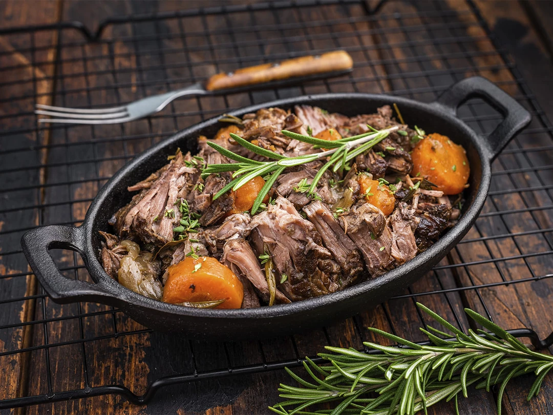 - Бёф бургиньон — говядина, томлённая в красном вине с луком, морковью и тимьяном. Родом из Бургундии, где вино умеют не только пить, но и использовать в готовке.