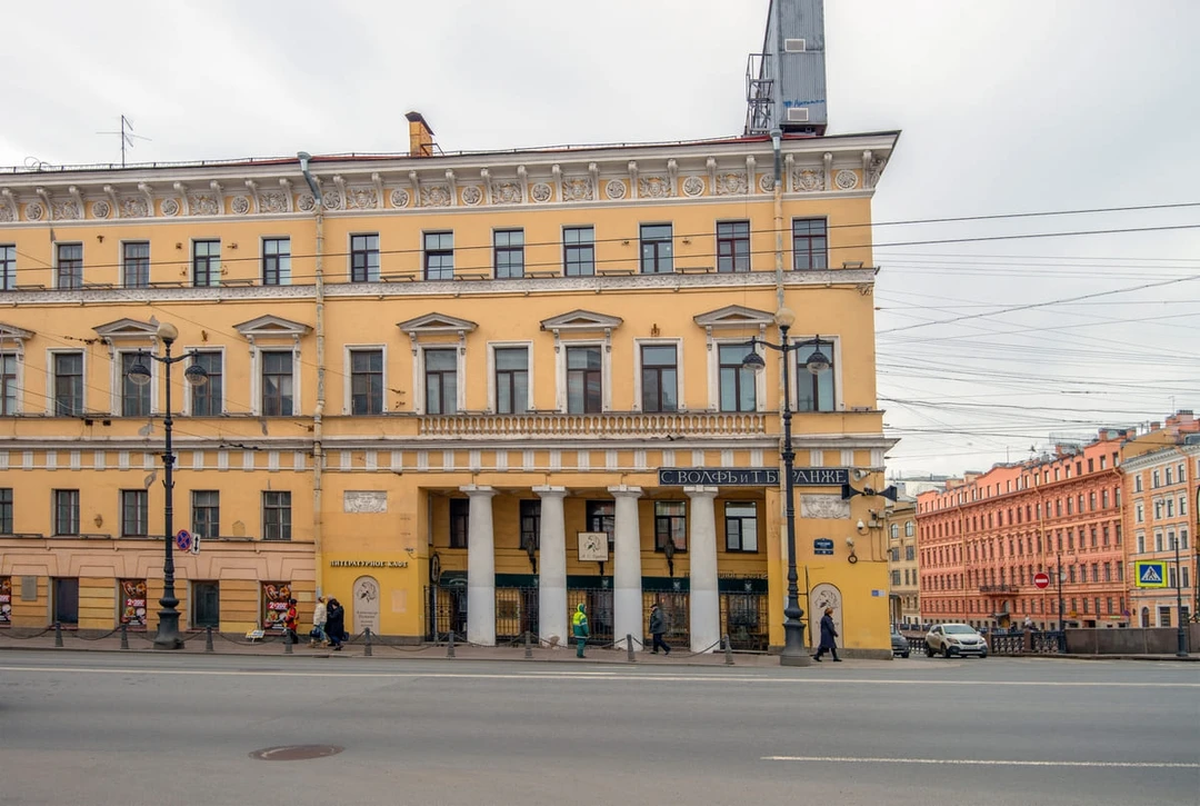 Два столетия назад в этом здании располагалась кондитерская «Вольф и Беранже», где собирались известные писатели XIX века. Отсюда стилистика литературного салона в современном интерьере: книжные полки, плотные портьеры на окнах и дверях, лампы с зелёным абажуром и даже чучело медведя.