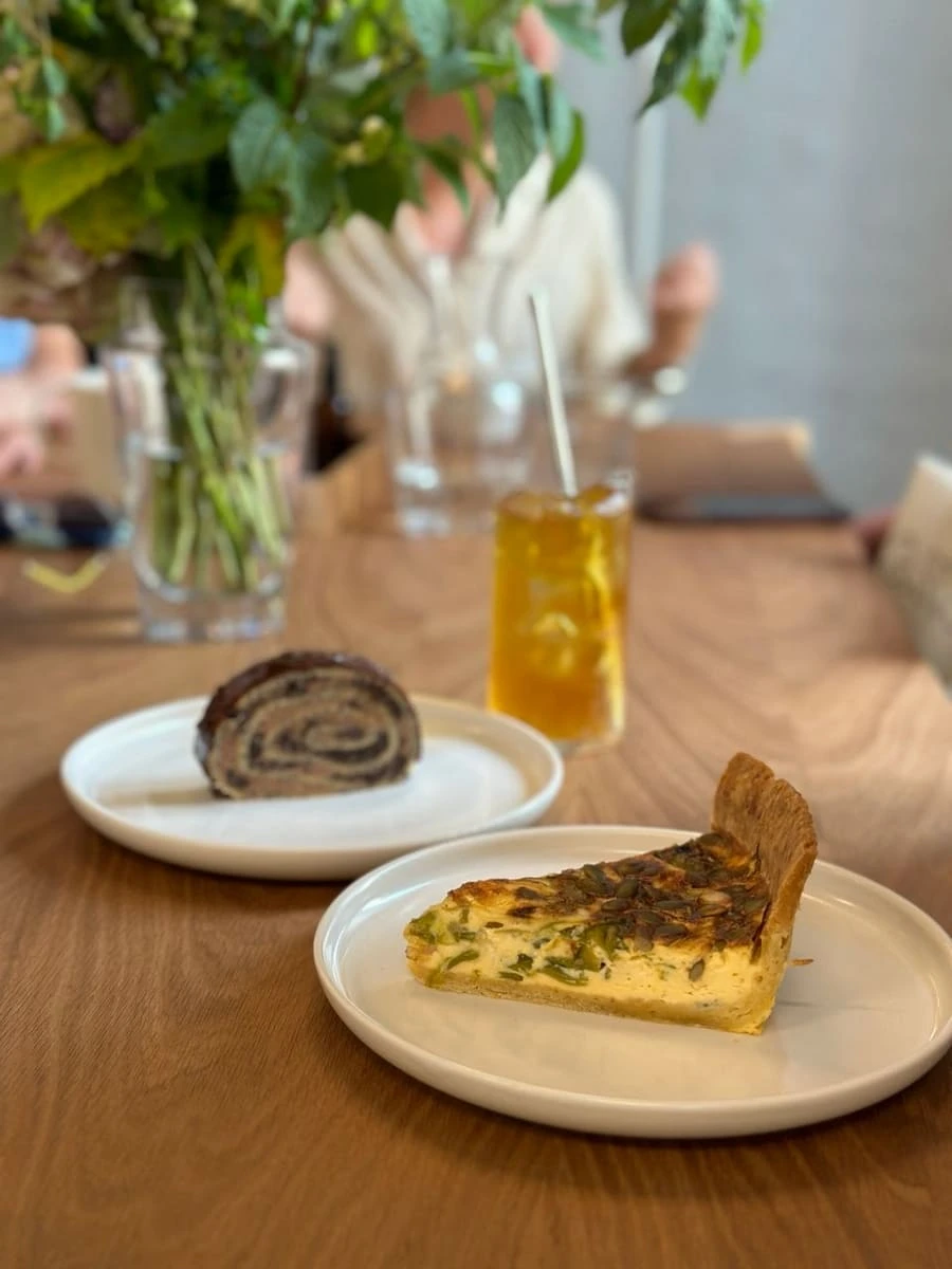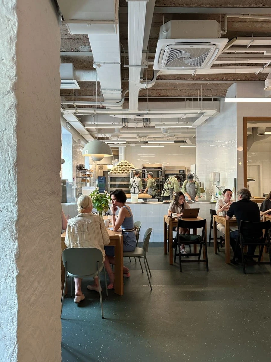Местная витрина — настоящий рай для любителей сдобы. Здесь есть всё — бейглы, дениши, краффины — и даже больше: например, пудинг из сдобы. К любимым булочкам наливают один из шести сортов кофе, который заваривают с помощью воронки. А пока несут заказ, можно наблюдать за процессом производства через стекло, отделяющее посетителей от зоны кухни.