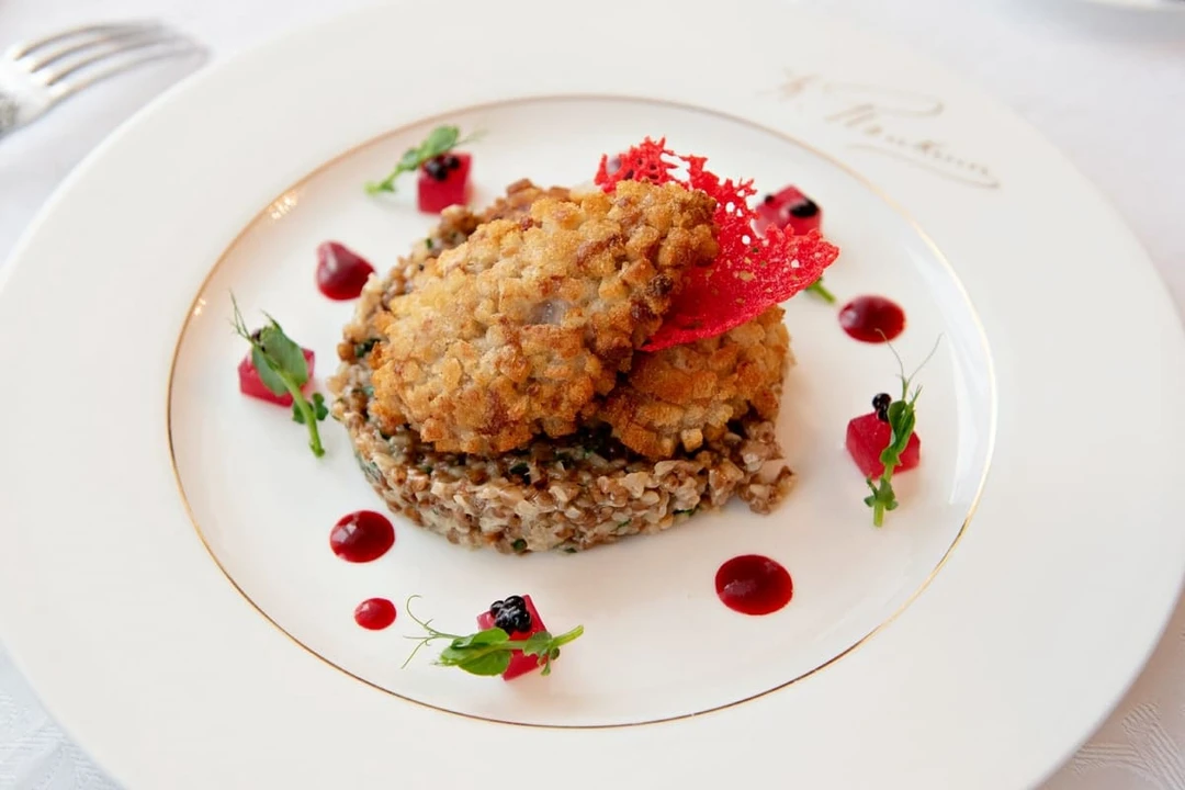В старинном доме на Невском готовят блюда русской кухни, описание которых можно встретить на страницах книг Пушкина. Грузди со сметаной, говядина по‑строгановски, котлеты «Пожарские» и любимые щи Александра Сергеевича — не просто меню, а кулинарная поэзия, способная вдохновить на трапезу даже самого взыскательного гурмана. После основных блюд на десерт берите бланманже — французское угощение на основе миндального молока, желатина и сахара, популярное у высшего света первой половины XIX века. В этом ресторане СПб его подают с малиново‑клубничным джемом.