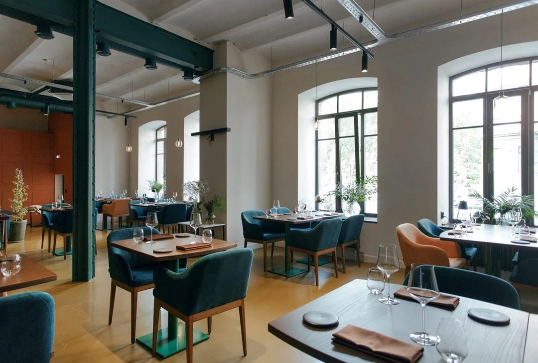 Под ресторан переоборудована бывшая насосная станция во дворе технопарка «Ленполиграфмаш». Внутри максимум воздуха и света и минимум визуального шума, который отвлекал бы от еды. Все блюда готовят из сезонных продуктов с локальных ферм, а часть кухни занимает собственная пекарня, которая наполняет зал ароматом свежего хлеба.