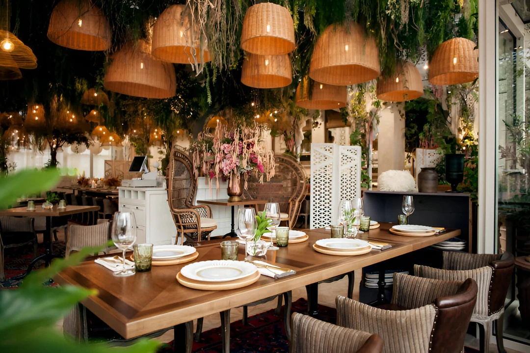 Популярный ресторан у поклонников азиатской и паназиатской кухни. Проект интерьера разрабатывали дизайнеры из сингапурского бюро, так что оформление соответствует специфике места. Всё в азиатском стиле: минималистичный декор из натуральных материалов, яркая зелень и мягкие цвета мебели и стен.