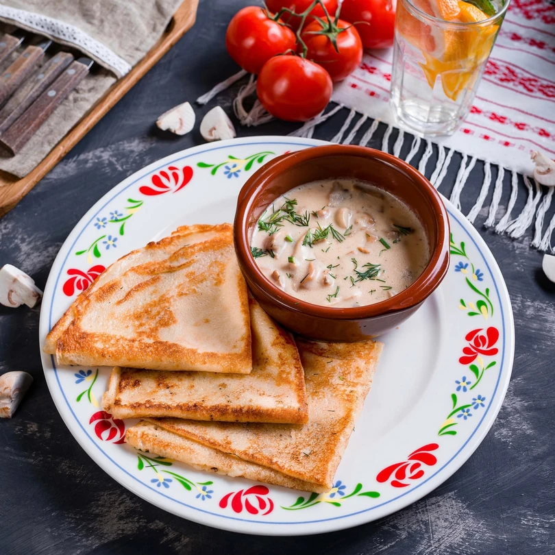 - Блинчики с мачанкой — густым соусом на основе тушёной говядины и бульона