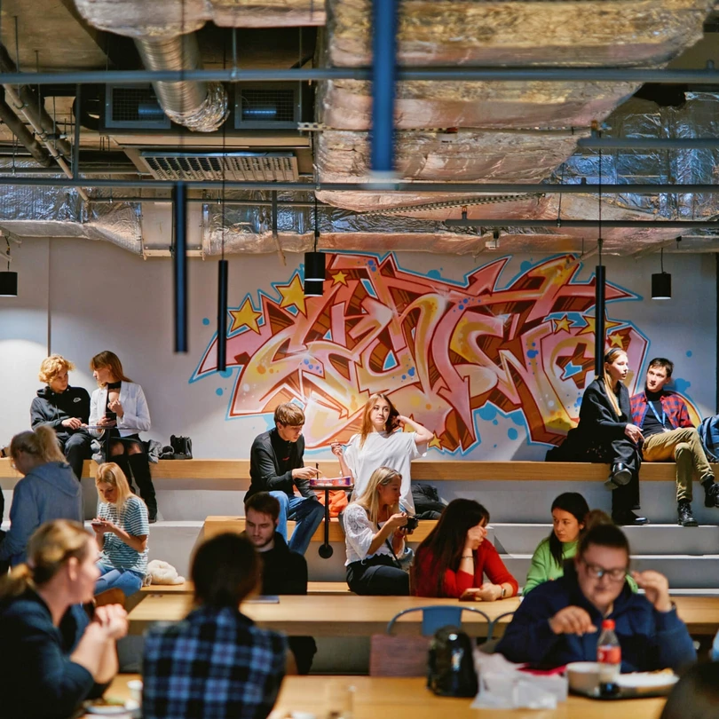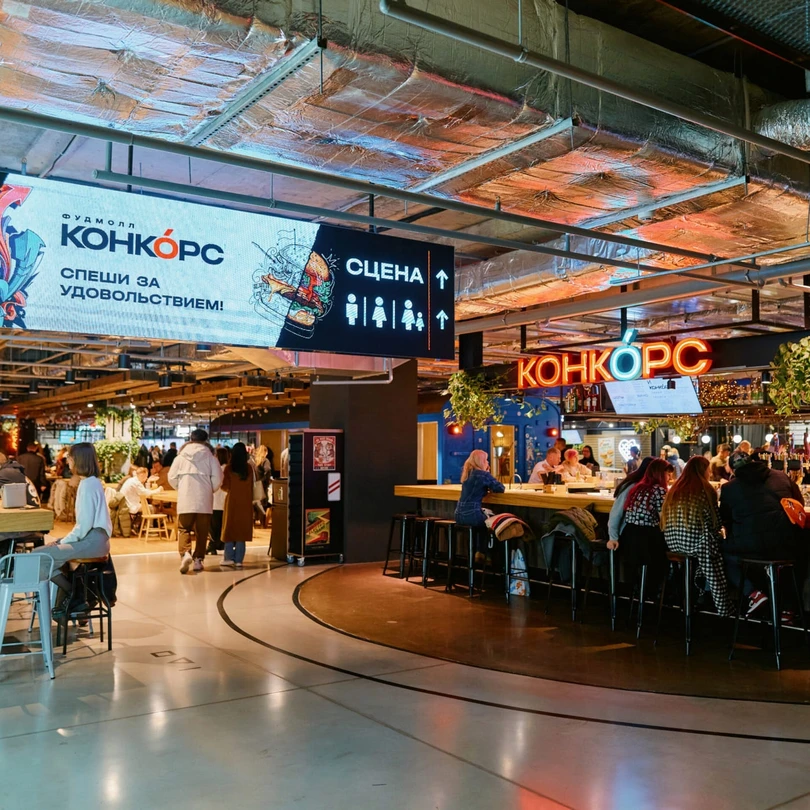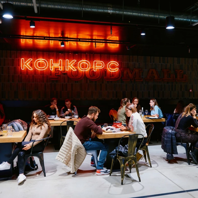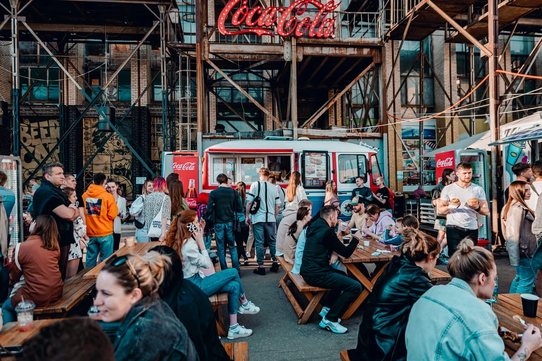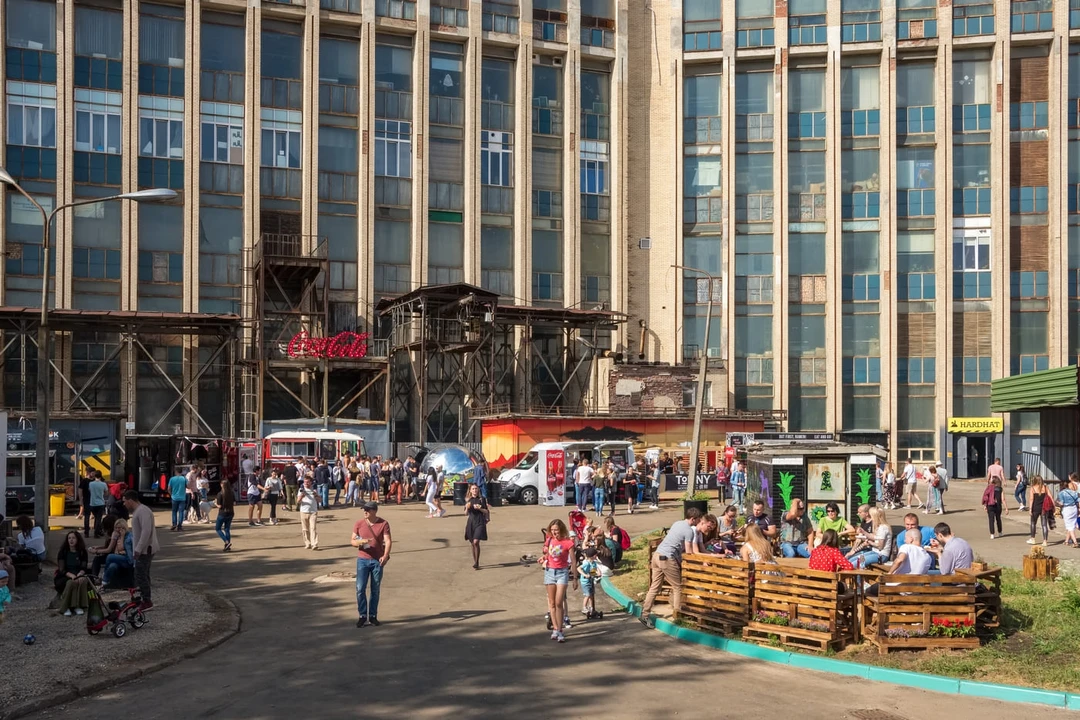 Открытая городская площадка с корнерами и фуд‑траками. У каждой точки своё направление: в одних готовят бургеры и хот‑доги, в других делают пиццу и роллы. При этом пространство работает не только как гастрономическая зона — по вечерам здесь проходят концерты, кинопоказы и мастер‑классы.