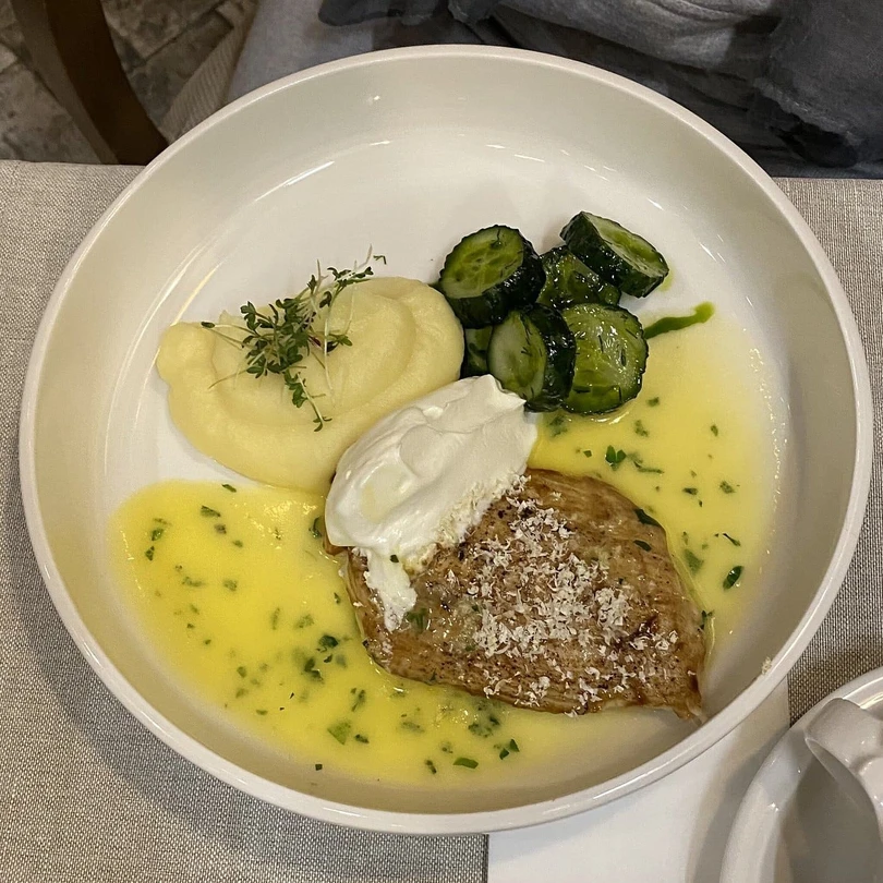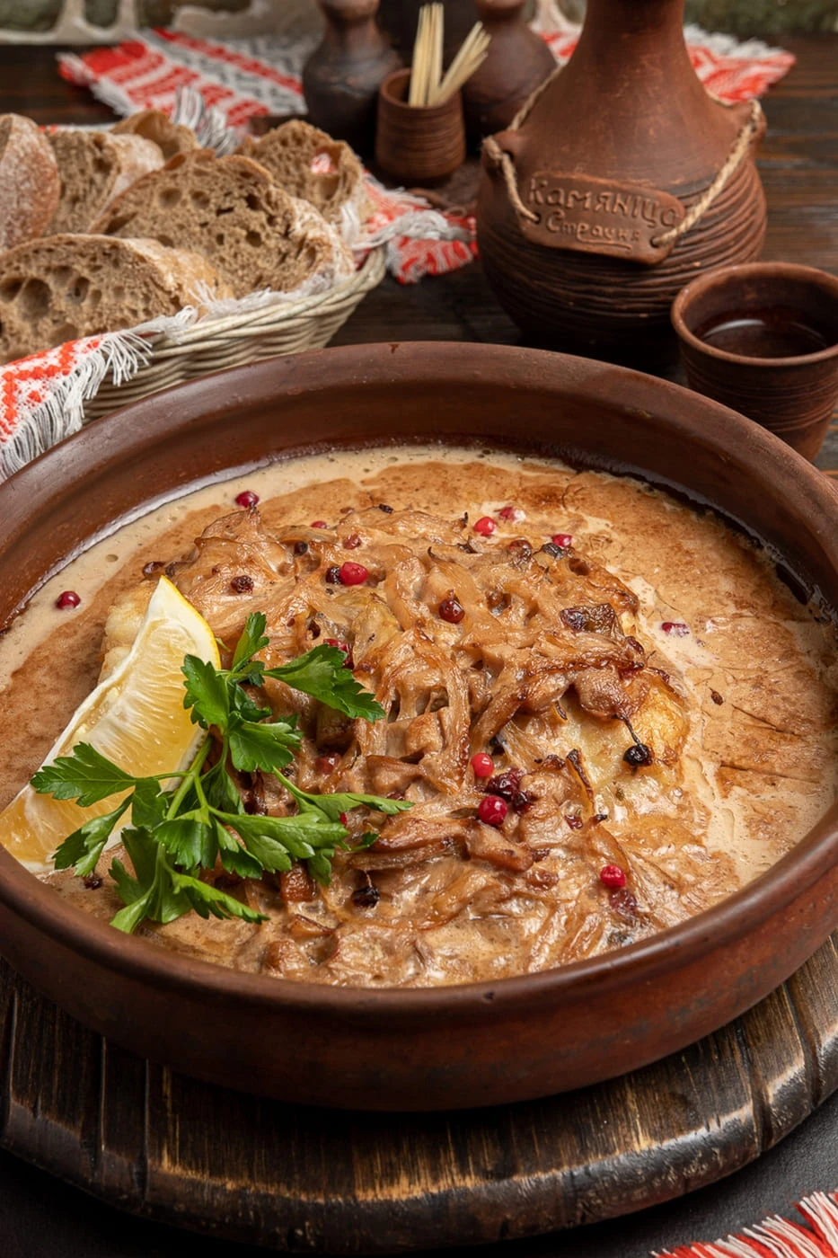 - Судак по‑нёмански — филе речной рыбы в сливочном соусе с белыми грибами и луком