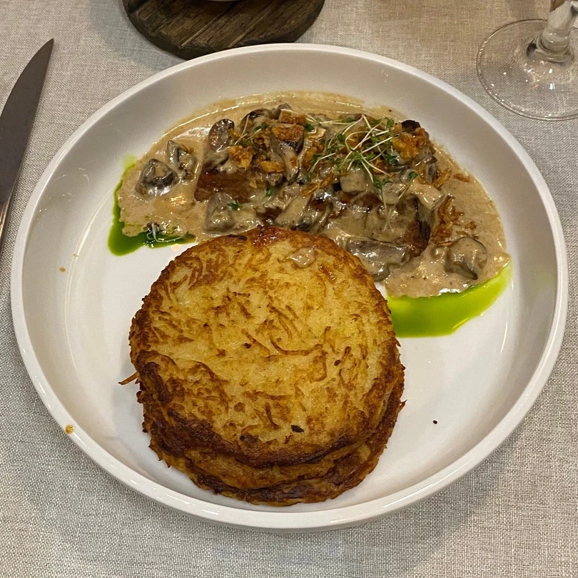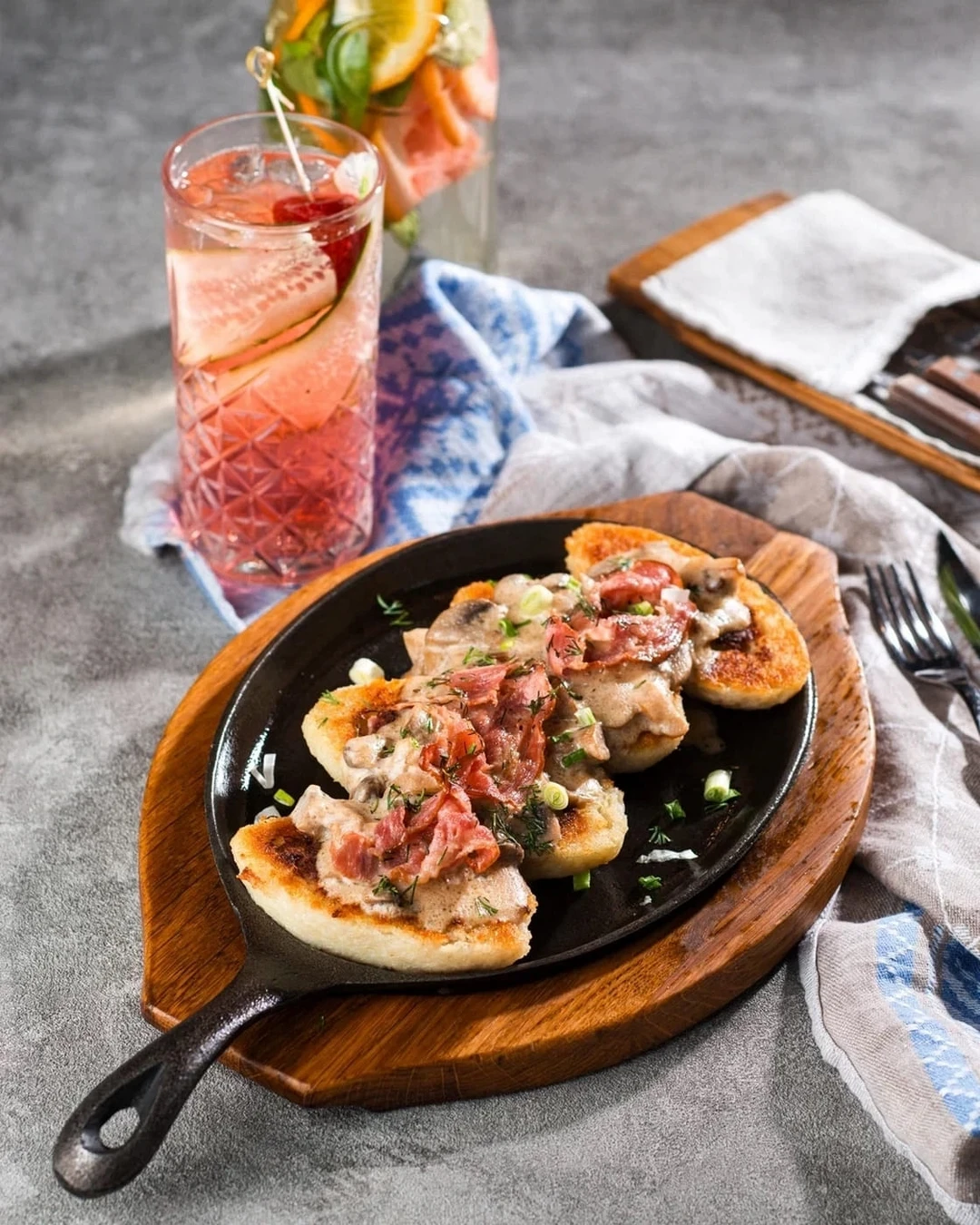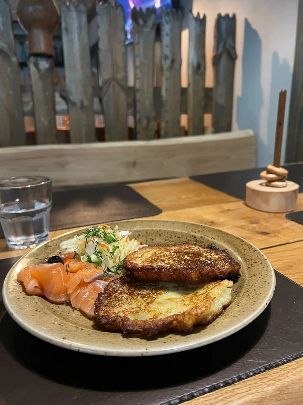 - Драники с разными сопровождениями — от сметаны и шпинатного песто до бефстроганова и солёной форели