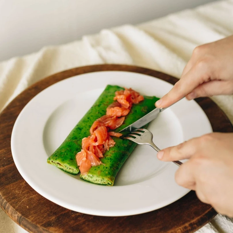 - Зелёные блины с лососем. В тесто добавляют шпинат, поэтому у блюда яркий цвет