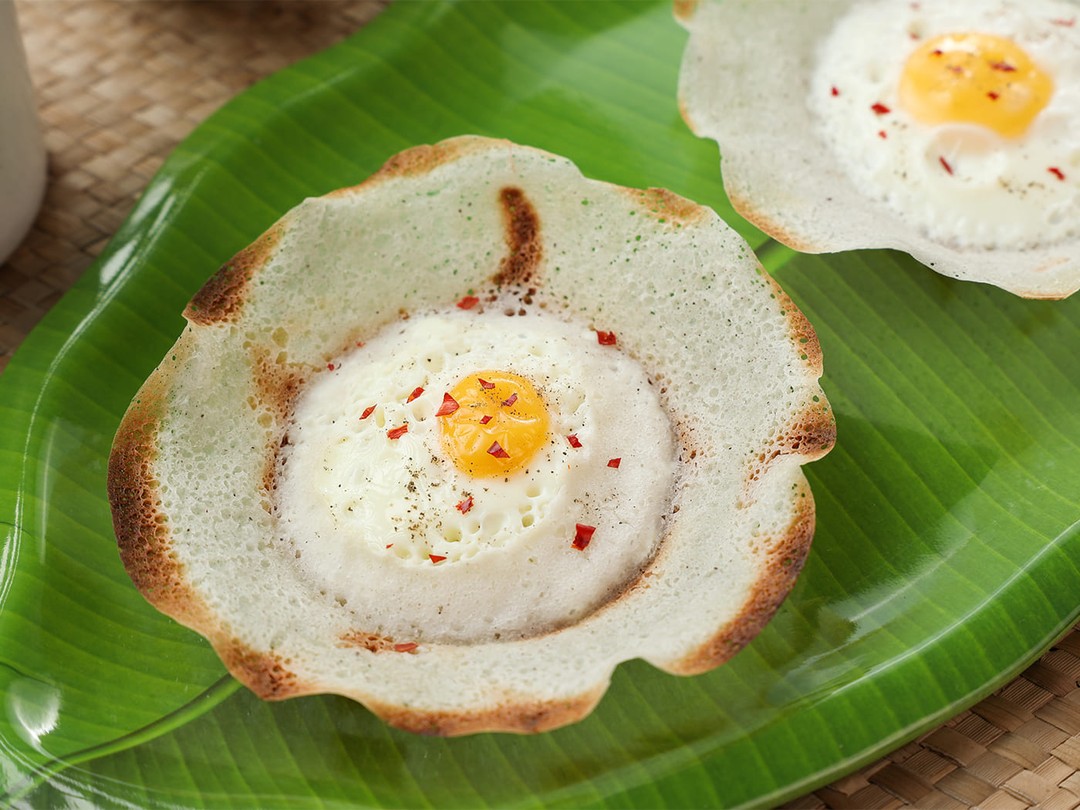 - Хопперс — тонкие блинчики из рисового теста на кокосовом молоке. Они готовятся в маленькой глубокой сковороде и приобретают форму чаши с хрустящими краями. Часто в центр добавляют яйцо и подают с острыми соусами