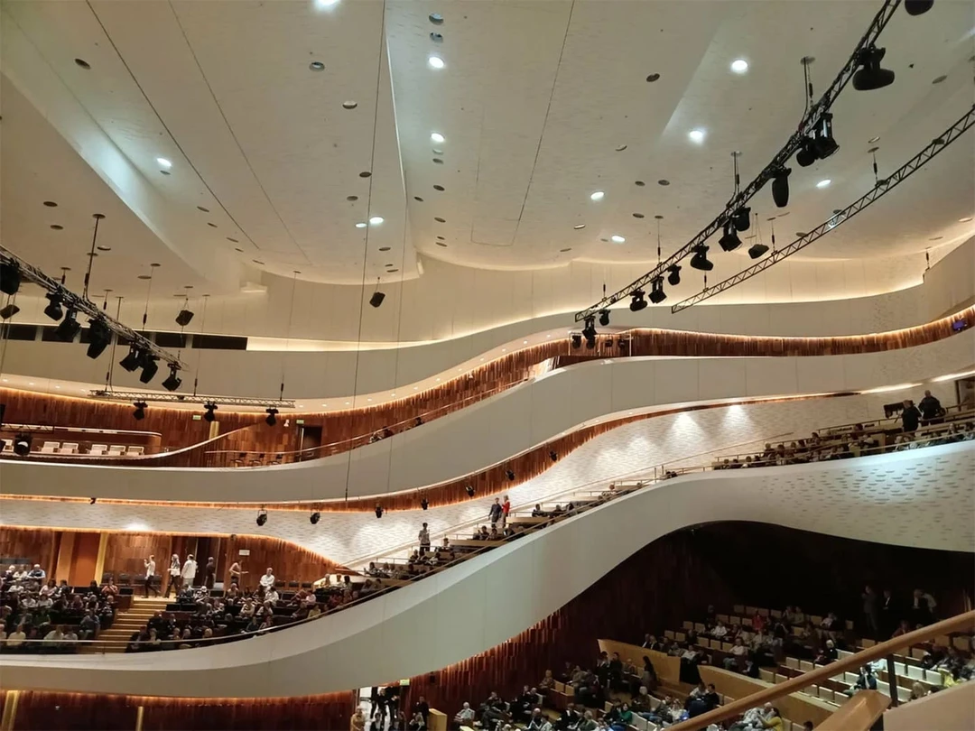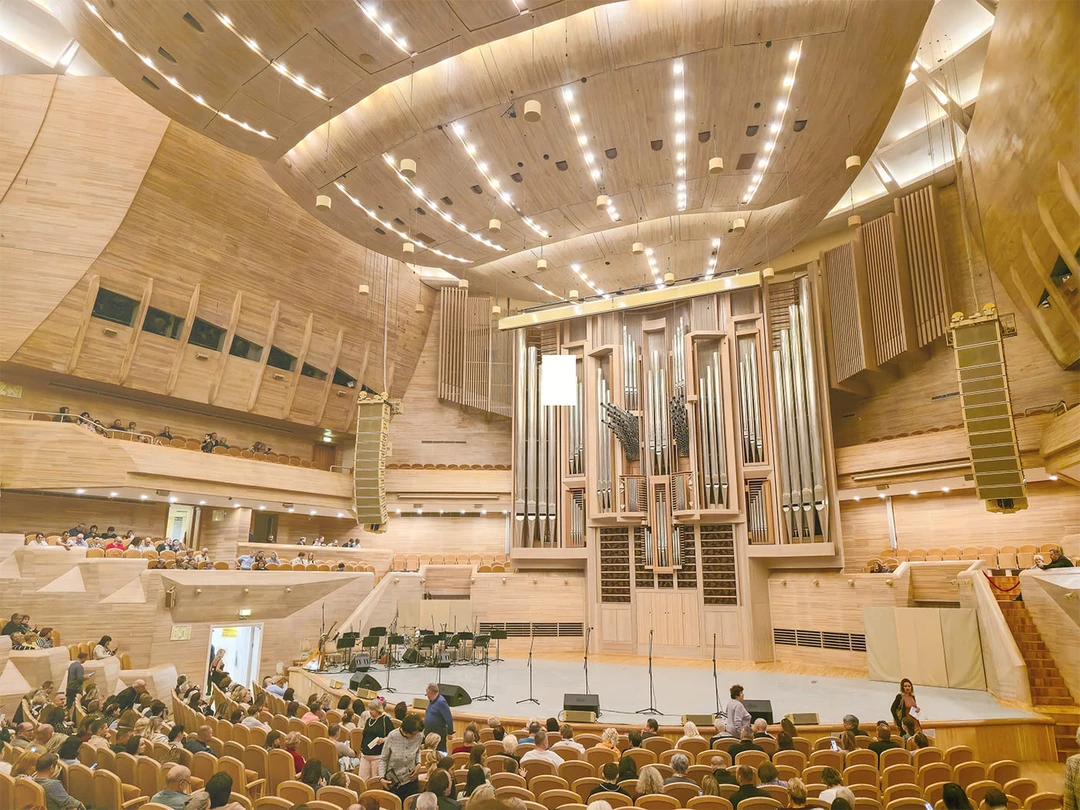 Стены, пол и даже потолок зала на 1700 зрителей отделаны лиственницы. Считается, что это дерево обладает отличными акустическими свойствами и помогает распространять громкий и чистый звук. Посадочные места здесь расположены полукругом и в несколько ярусов — так, чтобы каждый посетитель мог видеть музыкантов. Сцену украшает уникальный 14-метровый орган, созданный специально для Дома музыки немецкими производителями.
