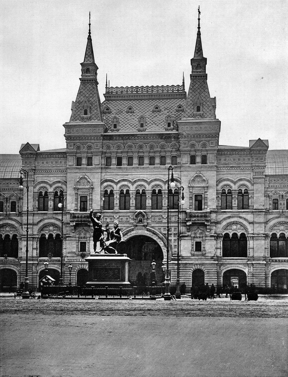 Огромный торговый комплекс в русском стиле построили в 1893 году по проекту архитектора А. Н. Померанцева. Для того времени здание было уникальным: в нём работала собственная электростанция, был водопровод, скважина с артезианской водой и даже небольшая железная дорога для перевозки товаров. А над торговыми рядами простирался стеклянный потолок, спроектированный знаменитым инженером В. Г. Шуховым.