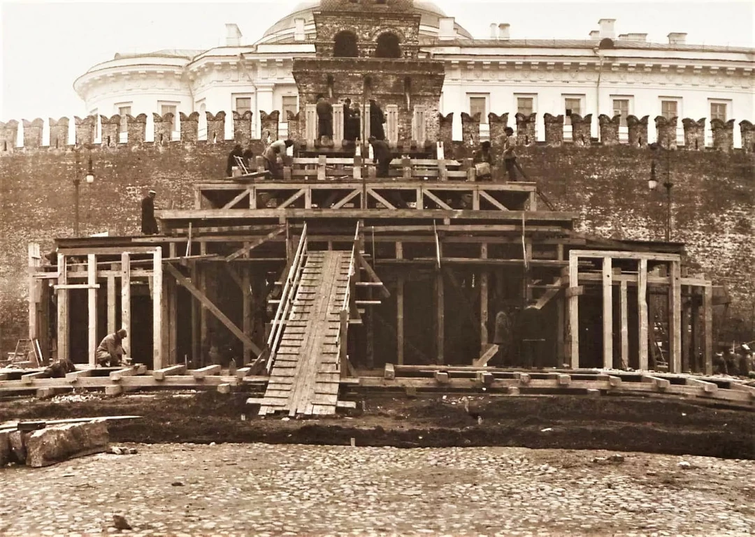Это третья по счёту усыпальница В. И. Ленина. Первую возвели в 1924 году в рекордно короткие сроки: деревянную конструкцию собрали всего за три дня. Позже на Красной площади построили более основательное деревянное здание. Третий Мавзолей, который дошёл до наших дней, возвели в 1930 году по проекту архитектора А. В. Щусева.