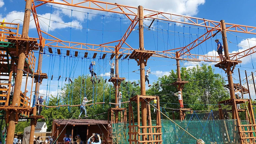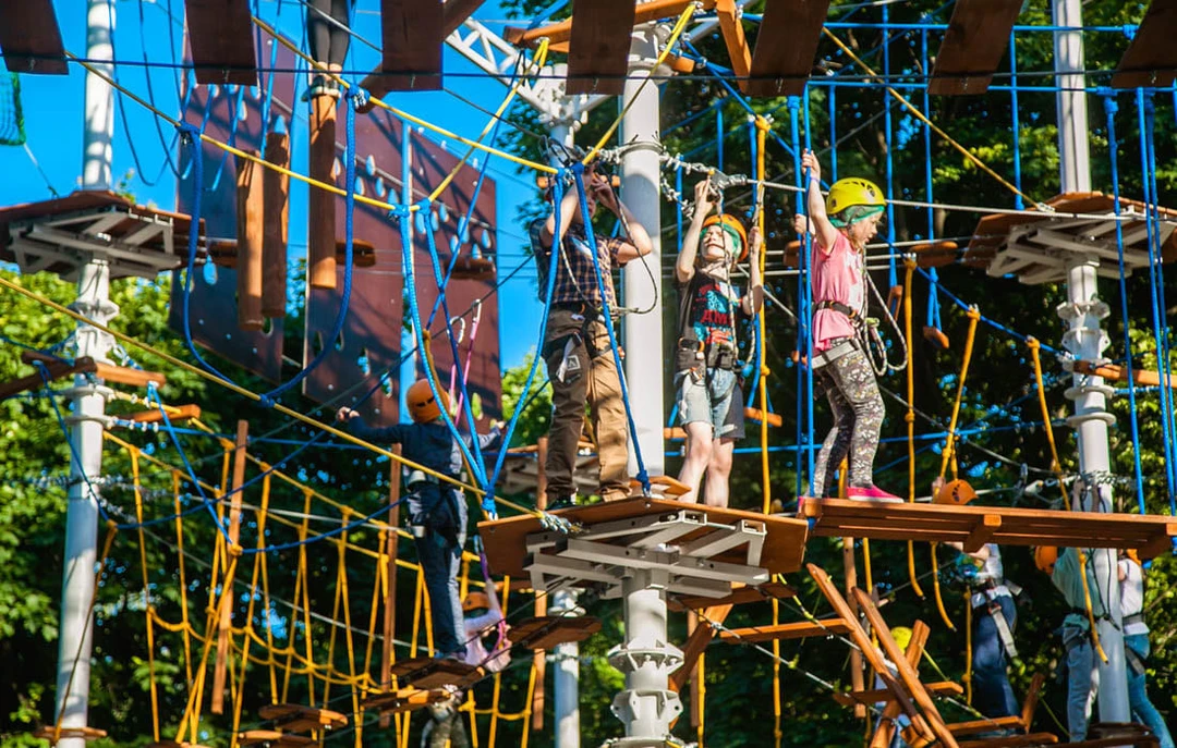 Преодоление трассы, созданной из канатов (а также всевозможных деревянных платформ и лесенок) и расположенной на высоте не менее двух метров, — ещё одна популярная форма активного отдыха для всей семьи.