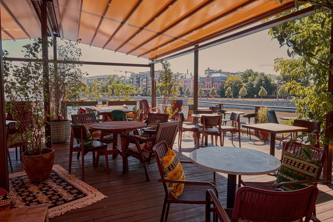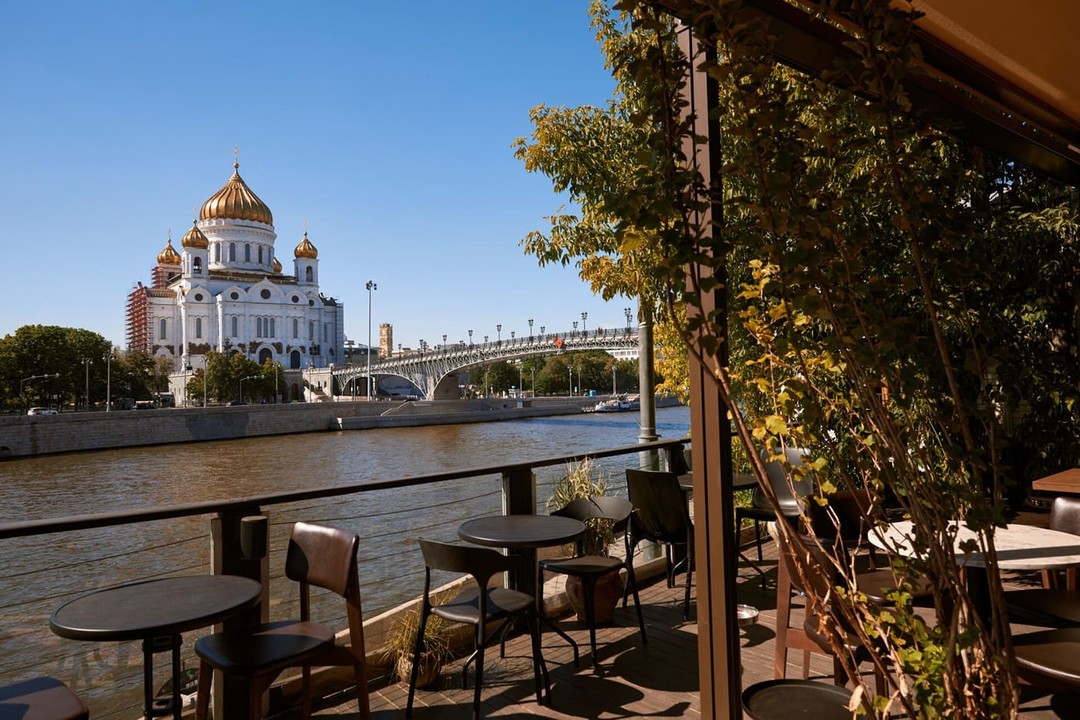 Подкрепиться после прогулки и продолжать любоваться городским пейзажем можно с террасы ресторана Kilim на Берсеневской набережной. Отсюда открывается шикарный вид на храм Христа Спасителя и Патриарший мост. А ещё здесь приятно спрятаться от летней жары: уютный интерьер в восточном стиле с коврами, расшитыми подушками и обилием зелени располагает к отдыху. На летней террасе по вечерам играют диджей‑сеты.