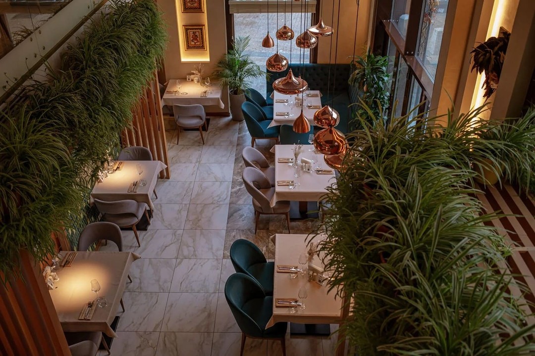 В ресторане всё сделано с большим вкусом: интерьер в стиле ар‑деко с изразцовым потолком, зеркалами и шахматной плиткой на полу — тут будто переносишься в парижское бистро. В меню — в основном европейская кухня с вкраплениями русских блюд. Можно съесть стейк, пасту, сибас на гриле, тартар или сибирские пельмени. Также в ресторане предлагают морские деликатесы вроде устриц и гребешков. Вишенка на торте — вид с террасы на Большой театр и улицы Петровка и Неглинная.