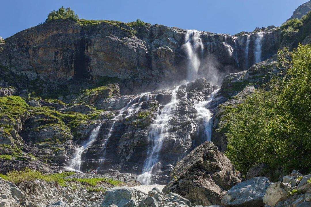 Следующая локация маршрута — ущелье Домбай‑Ульген, куда приезжают ради Чучхурского водопада. Здесь бурлящие потоки воды низвергаются вниз с 12‑метровой скалы. Затем группа отправляется к конечной точке экскурсии — берегу ледниковой реки Уллу‑Муруджу, воды которой считаются целебными из‑за высокого содержания серебра.