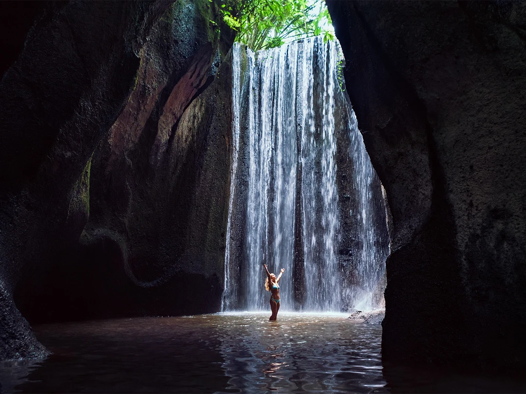 Водяной каскад прячется в центре острова Бали. Его мощные струи обрушиваются одним потоком в узком ущелье среди скал, из‑за чего создаётся впечатление, будто водопад расположен в пещере.