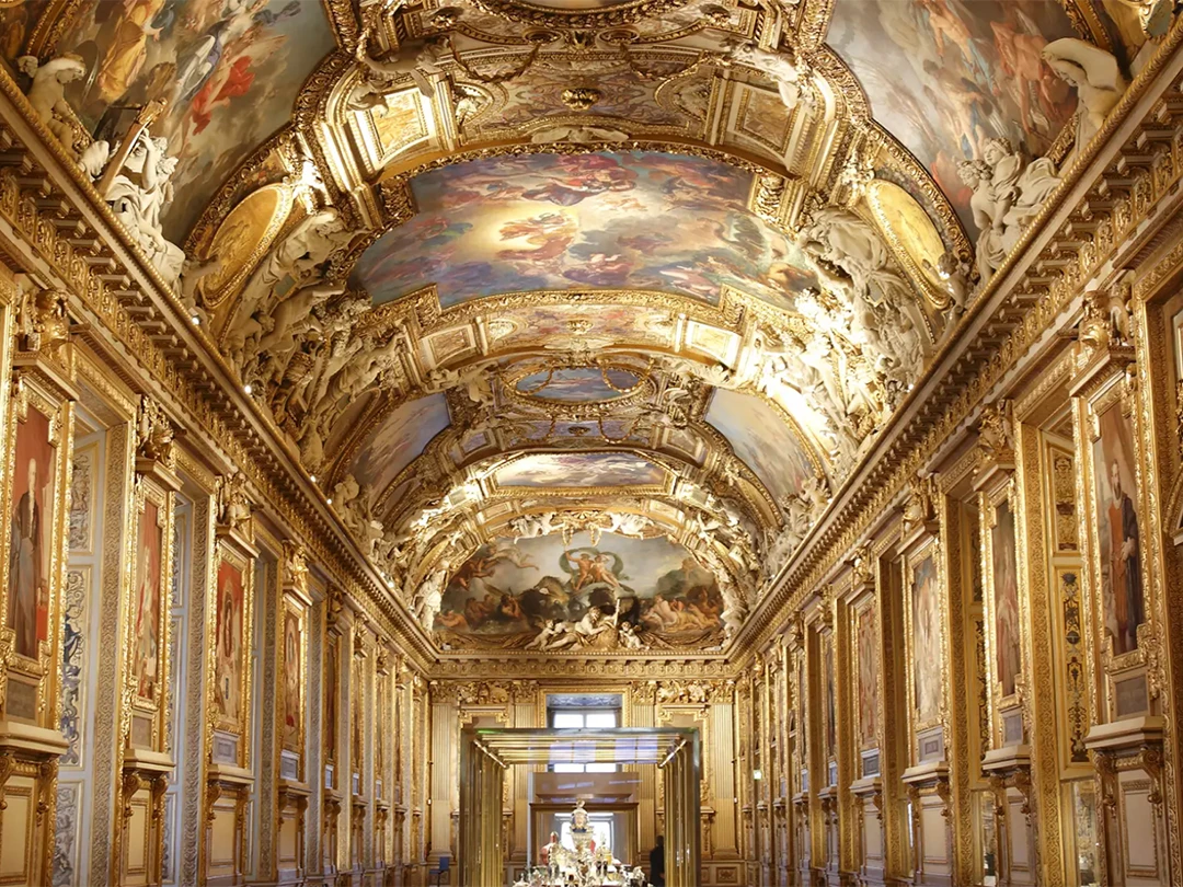 Убранство Лувра тоже впечатляет помпезностью и богатством. Первое, на что гости дворца обращают внимание, — монументальные мраморные лестницы с позолоченными узорами на перилах. А некоторые залы музея — произведения искусства сами по себе. Например, потолки и стены Летних апартаментов Анны Австрийской (несколько комнат, где выставлено античное искусство) украшены роскошной лепниной и фресками. Блеск золота и хрусталя ослепляет!