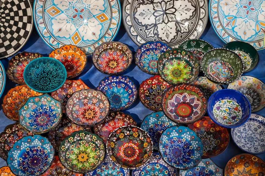 - Керамика. Тарелки, кружки и кувшины с геометрическими и растительными орнаментами