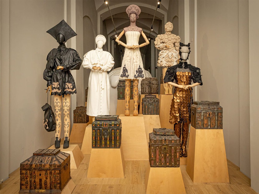 Выставка погружает посетителей в мир образов из «преданий старины глубокой». Среди них — загадочные царевны, крылатые девы и превращённые в морские волны красавицы. Особенно впечатляет «Изразцовый зал», в котором красуется шёлковая печь в натуральную величину. Среди самых ярких экспонатов выставки — платье «Божественная Майя», отсылающее к Чёрному лебедю, одному из главных образов великой Майи Плисецкой (сегодня этот наряд хранится в коллекции Эрмитажа).
