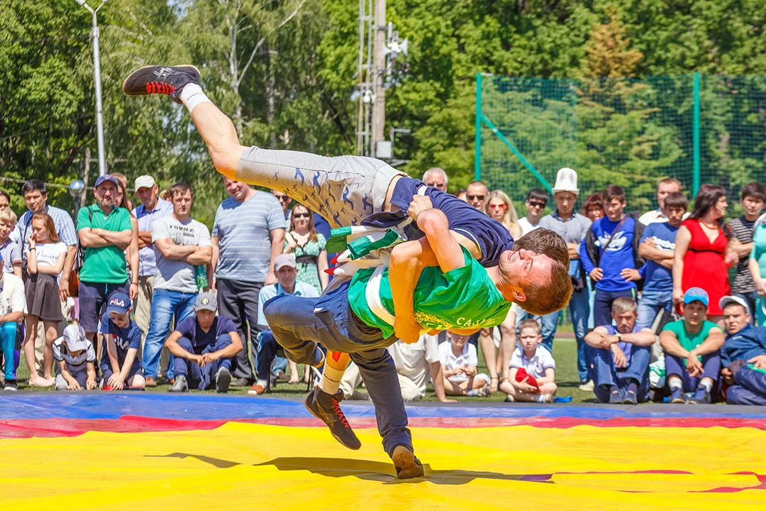 Сегодня Сабантуй — это весёлый праздник с национальными песнями и плясками, весёлыми конкурсами и шуточными состязаниями: бегами с коромыслом или борьбой мешками. А самые крепкие соревнуются в национальной борьбе куреш: чтобы выиграть, нужно уложить соперника на лопатки с помощью закинутого ему за спину полотенца или пояса. И, конечно, ни один сабантуй не обходится без традиционных угощений: плова, баранины, перемячей (пирожков с мясом) и чак‑чака.