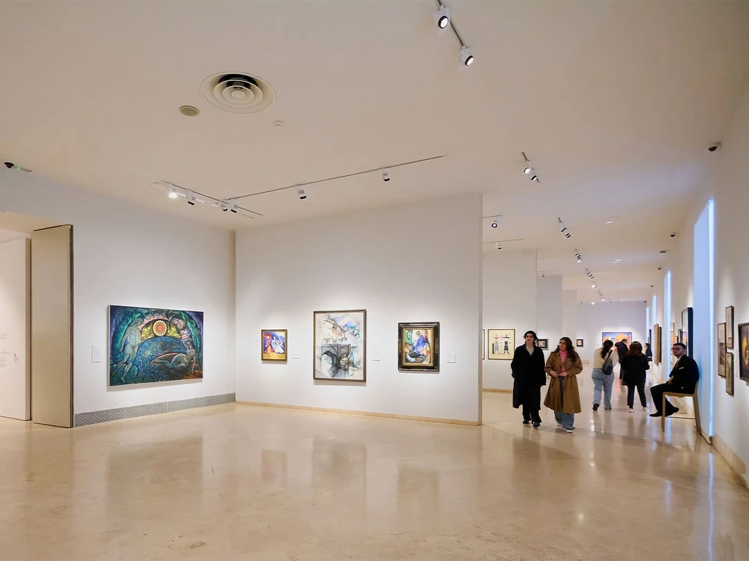 Внутри представлены работы выдающихся испанских и зарубежных художников середины ХХ века и современности. Здесь можно посмотреть на работы Энди Уорхола, Джеффа Кунса, Герхарда Рихтера и Марка Ротко. В музее также есть масштабные инсталляции и гигантские скульптуры. Например, «Материя времени» Ричарда Серры в виде огромного лабиринта из металлических конструкций или 13-метровый «Щенок» Джеффа Кунса, покрытый цветами.