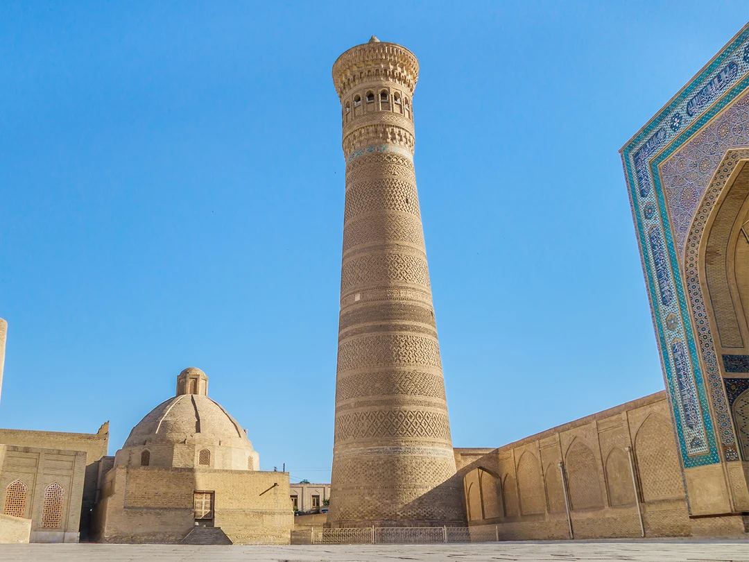Начать прогулку стоит с Регистана (название площади такое же, как в Самарканде). Здесь возвышаются построенные в XVI веке медресе Мири‑Араб и мечеть Калян. Самый впечатляющий памятник архитектурного комплекса — 48‑метровый минарет Калян, возведённый из сырцового кирпича в 1127 году. По легенде, чтобы обеспечить устойчивость конструкции, архитектор заложил фундамент глубиной 13 метров, а для прочности кладки использовал особый раствор с верблюжьей кровью. Величественный минарет в своё время настолько впечатлил Чингисхана, что при завоевании Бухары в 1220 году он приказал оставить башню нетронутой, в то время как большую часть города разрушили.