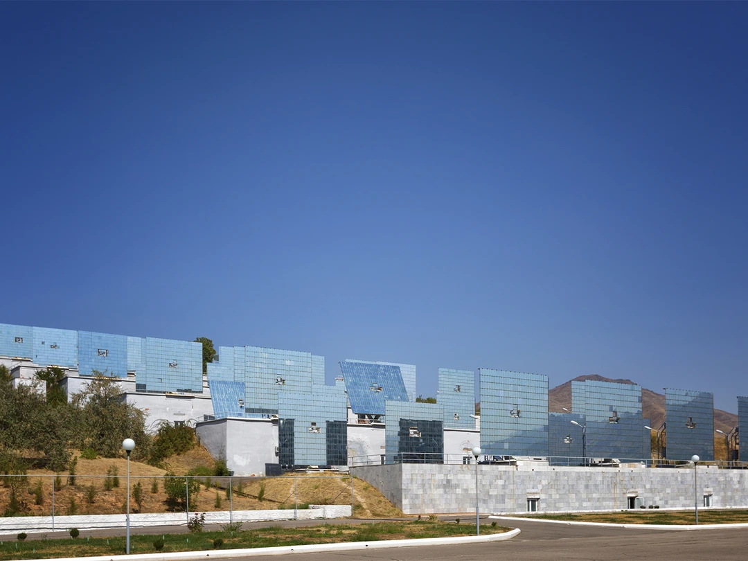 На склоне горы установлены 62 гелиостата — это подвижные зеркала, которые поворачиваются вслед за солнцем и направляют его лучи на громадный вогнутый щит размером 54 на 47 метров. Это главный концентратор солнечной установки: он фокусирует свет в одну точку, где возникает жар до 3000°C. Такая экстремальная температура нужна, чтобы создавать сверхчистые сплавы для авиационной и космической промышленности. В мире есть всего две такие установки: одна здесь, в Узбекистане, другая — во Франции.