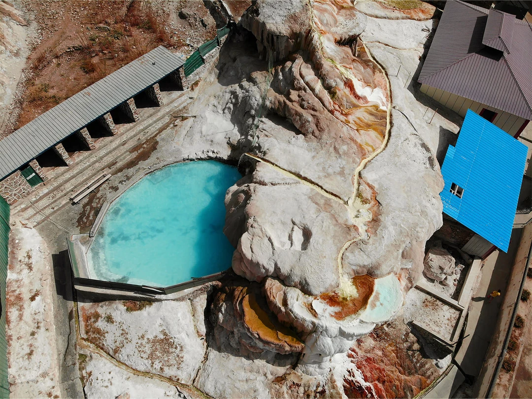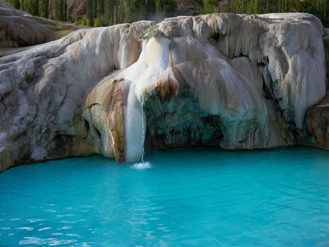 Пейзажи Гарм Чашма чем‑то похожи на травертины турецкого Памуккале: белые натёки, образующие целые террасы, и природные «ванны» с водой молочно‑белого цвета. Горячая минералка с высоким содержанием сероводорода и углекислоты бьёт из‑под земли мощными фонтанчиками от 10 сантиметров до 1,5 метра высотой. Температура воды в «бассейнах» Гарм Чашма колеблется от +38°C до +59°C, так что погружаться надо осторожно.